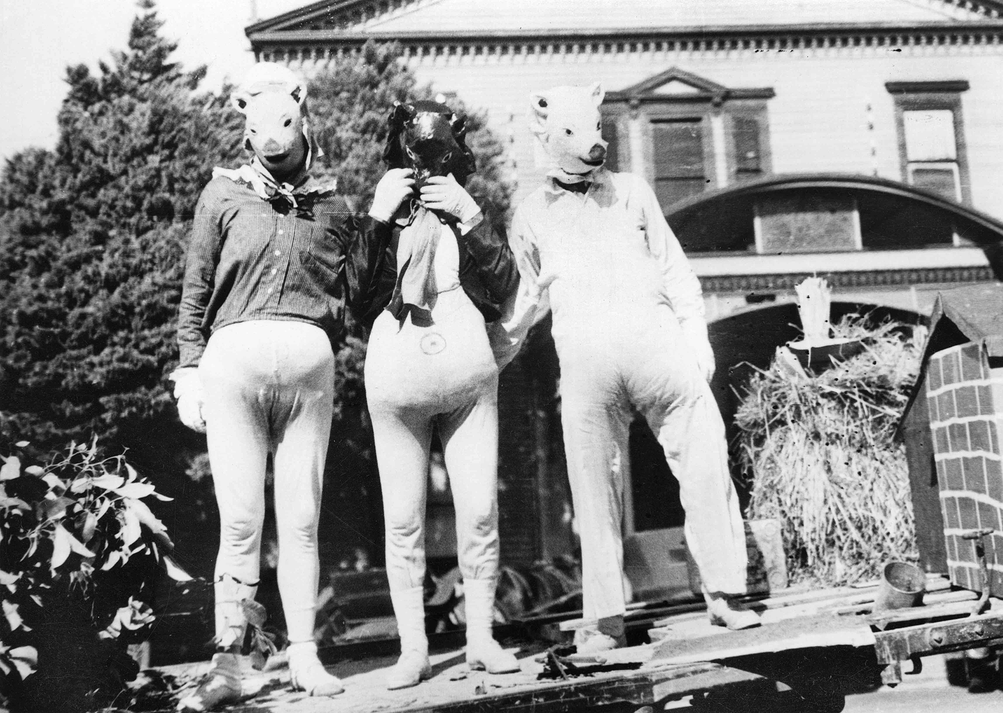 Black and white image of three men dressed as pigs standing on the back of a truck.