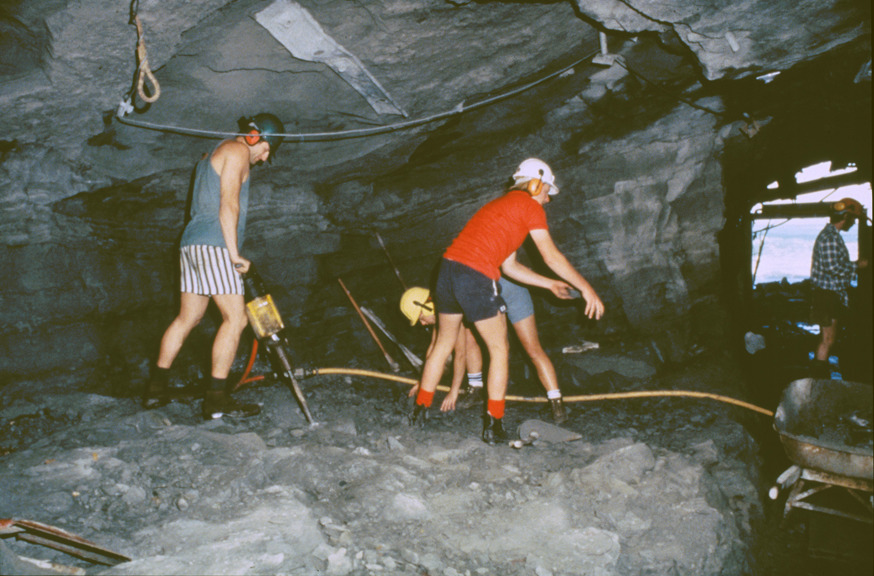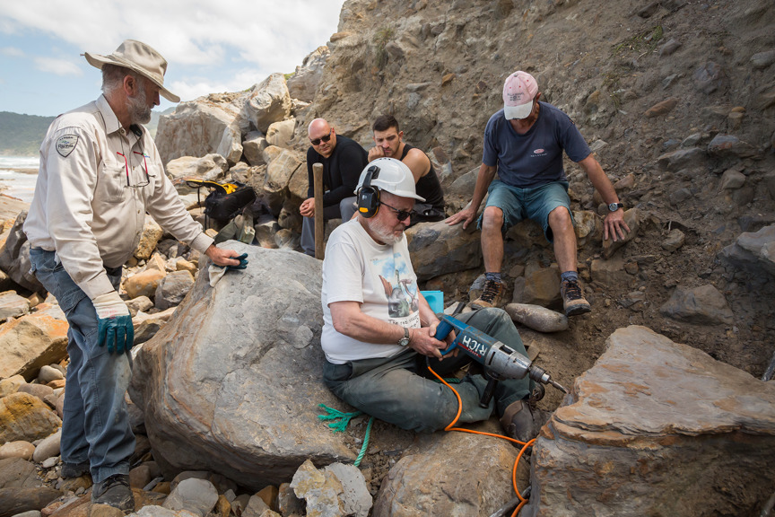 Excavating rock in the tunnel at Dinosaur Cove.
