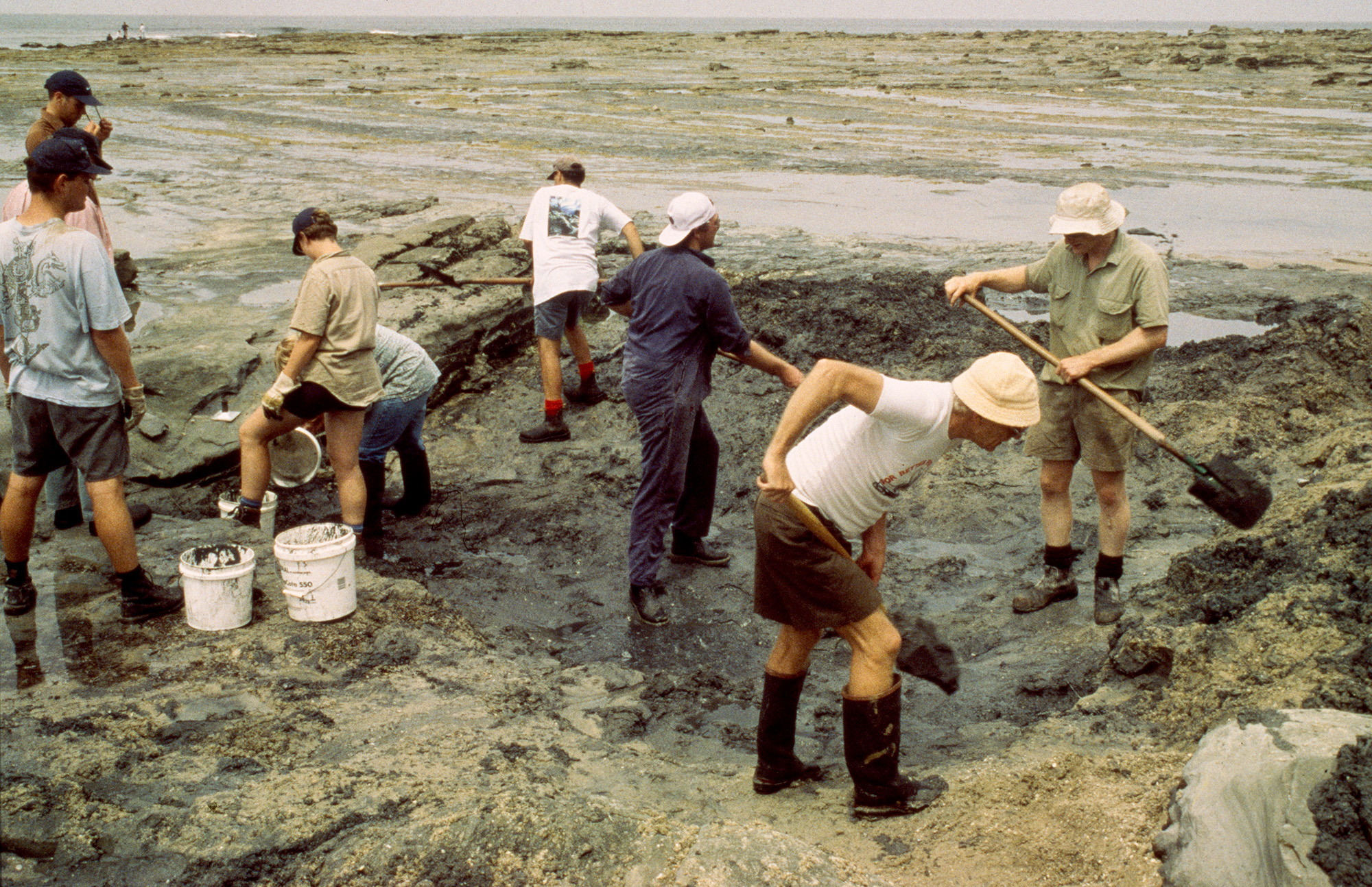 Eight people digging sand on a rocky beach