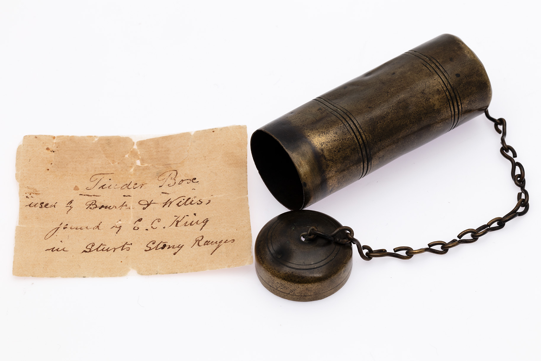 The tinder box was donated to the museum with a tiny, fragile note inside, written in faded ink: ‘Tinder Box used by Burke & Wills, found by E C King in Sturts Stony Ranges.’