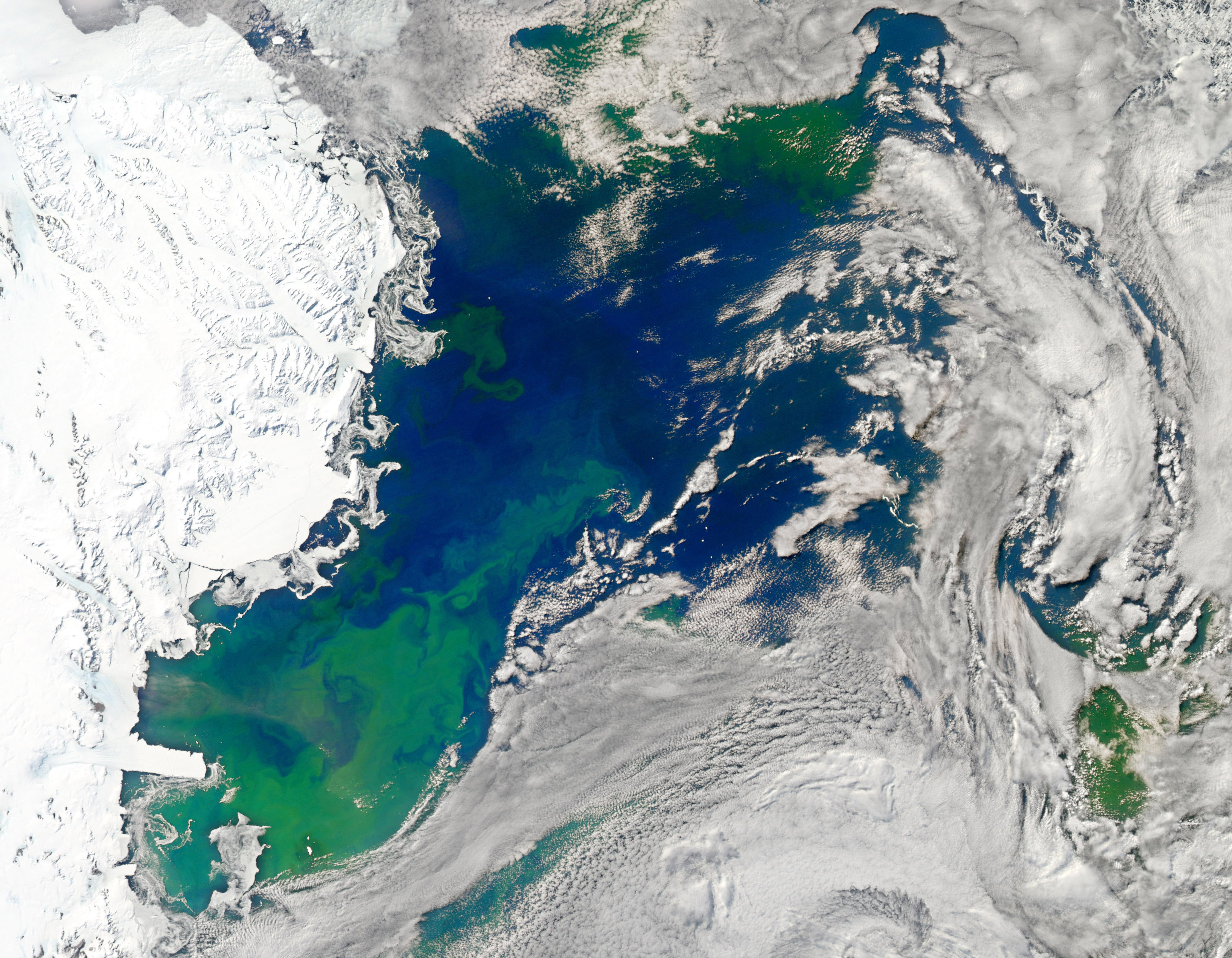 When the ice starts to melt in the warmer months, the algae are bathed in sunlight and freshwater rich in nutrients previously trapped in the brine pockets, especially iron. This change triggers blooms of algae—also known as phytoplankton—at the receding sea-ice edge so large they can be seen from space.
