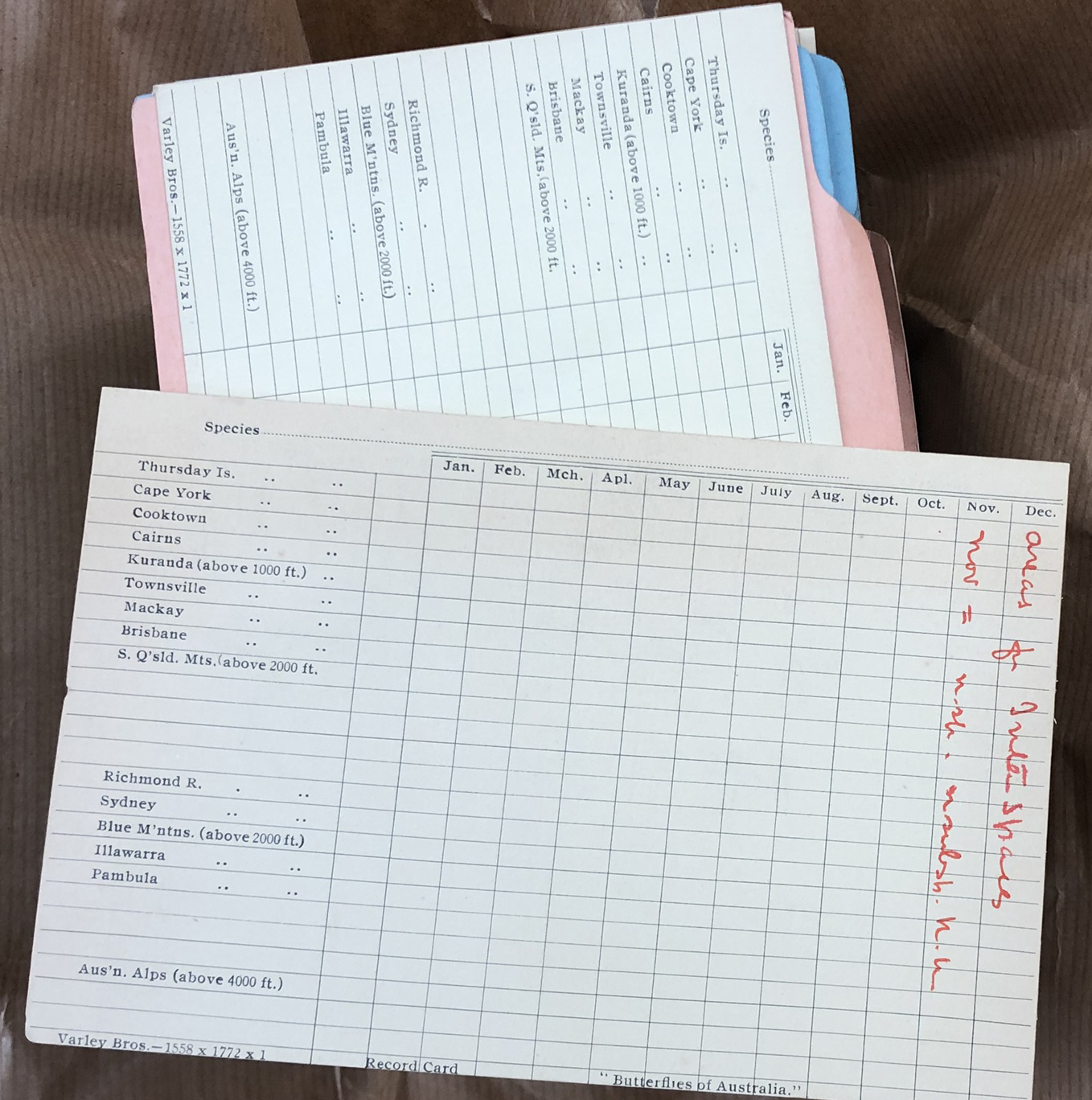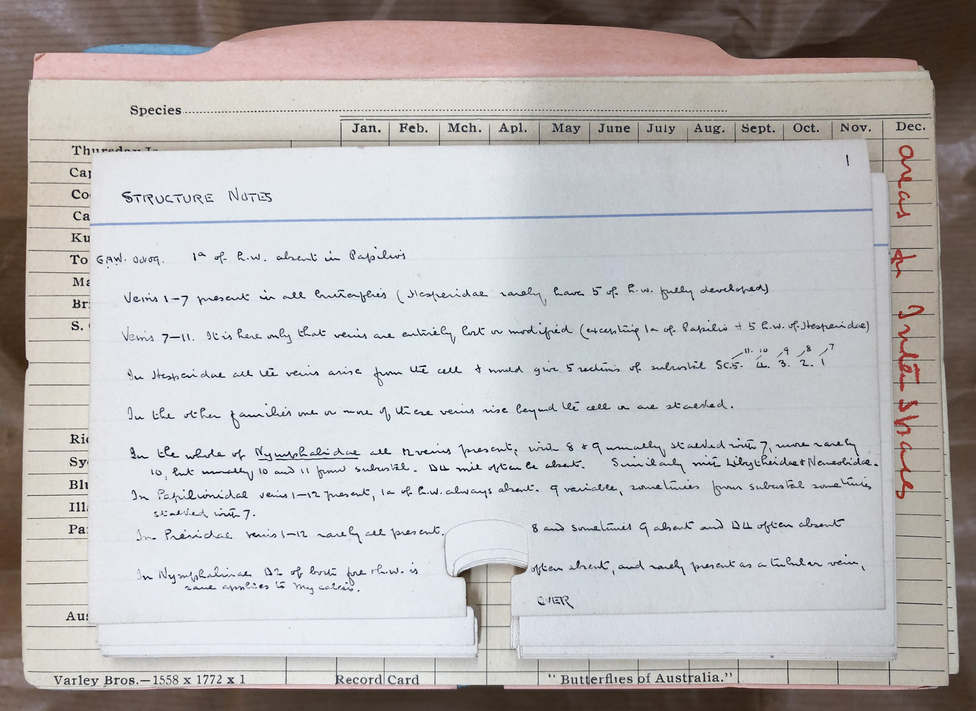 Sadly Waterhouse destroyed much of Lyell’s correspondence. In a letter dated 15 September 1928 we read: “I have destroyed some thousands of letters after of course entering the important notes on my cards.” This means that the story of the relationship between the two men is mostly told in the voice of Waterhouse. On a more positive note, the information Waterhouse received from Lyell, and which was used in the writing of The Butterflies of Australia was documented on index cards. These are held in the Museums Victoria Archives (Oldersystem~03037, Museums Victoria Archives).