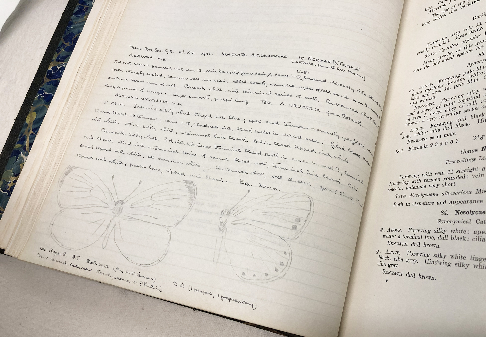 Waterhouse and Lyell were forever making notes of corrections in their letters. Lyell recorded these annotations in a bound publication of the book held in the Rare Book Collection at Museums Victoria Library. This copy, which contains pages for notes, records errata as follows: “Found a mistake in the butterfly book. The female figure of chrysotricha No 776 (I think) is really donnysa. I noticed it when I put your specimen in the cabinet the other day. At that time we did not know donnysa from WA and this sex is hard to tell. I also found one in my lot of chrysotricha - you should look through yours” - wrote Waterhouse on 22 December 1930 (OLDERSYSTEM~03031, Museums Victoria Archives).