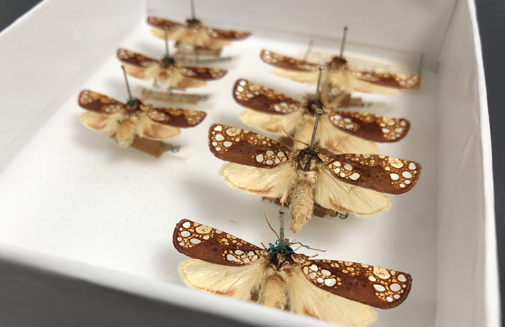 These are Dudgeonea actinias specimens from Townsville, Queensland, bred by Frederick Parkhurst Dodd in 1902 and posted to George Lyell in Gisborne, Victoria shortly afterwards. They are amongst some of the most beautiful moths in the Lyell Collection at Museums Victoria.