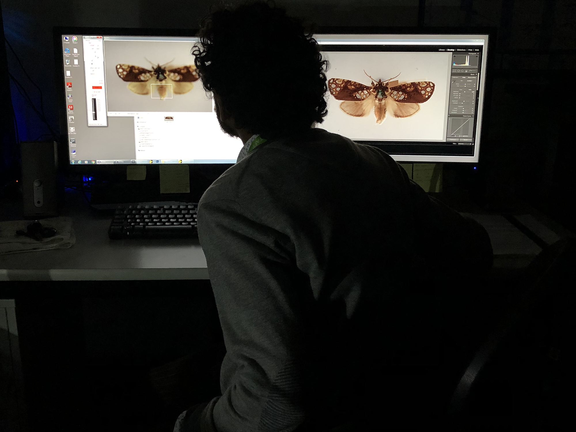 In Simon's steady hands, the specimen is carefully pinned to the tracing paper. The main lights in the room were then turned off, after which there were fourteen consecutive flashes as the specimen was photographed from the dorsal (upper side). Each photograph is tiered from the top of the pin to the lowest point on the specimen, to be compiled as one layered image.
