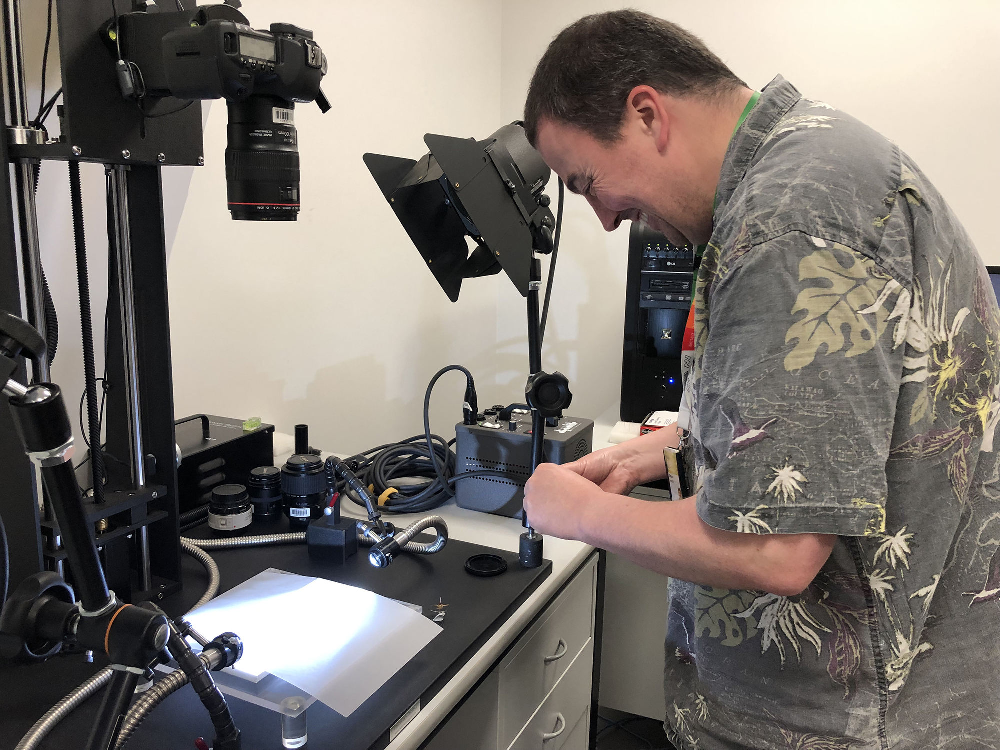 Entomologist Simon Hinkley had the painstaking task of removing the specimen from its home, the small box pictured above, and placing it on tracing paper at the base of the camera rig. In the photograph below you will note that on both sides the specimen has several lights directed at it, from above as well as from directly beside it. These multiple light sources, adjustable depending on the size of the specimen, ensure that the specimen is fully lit, with no shadows cast.