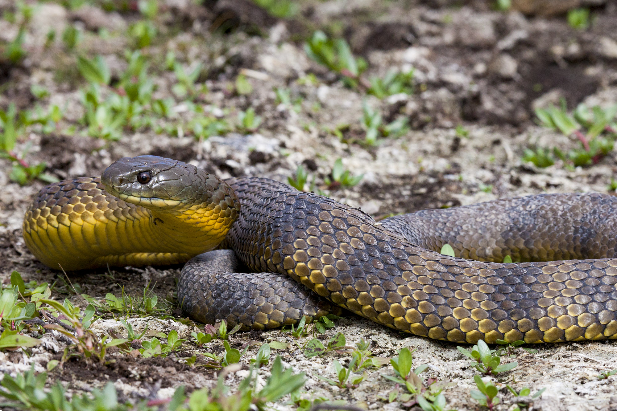 这种毒蛇身上常带有交叉条纹,尤其以条纹边缘的黄色纹路和老虎条纹颜色相似而得名虎蛇。实际上,虎蛇颜色各异,有的身上甚至根本没有任何纹路。