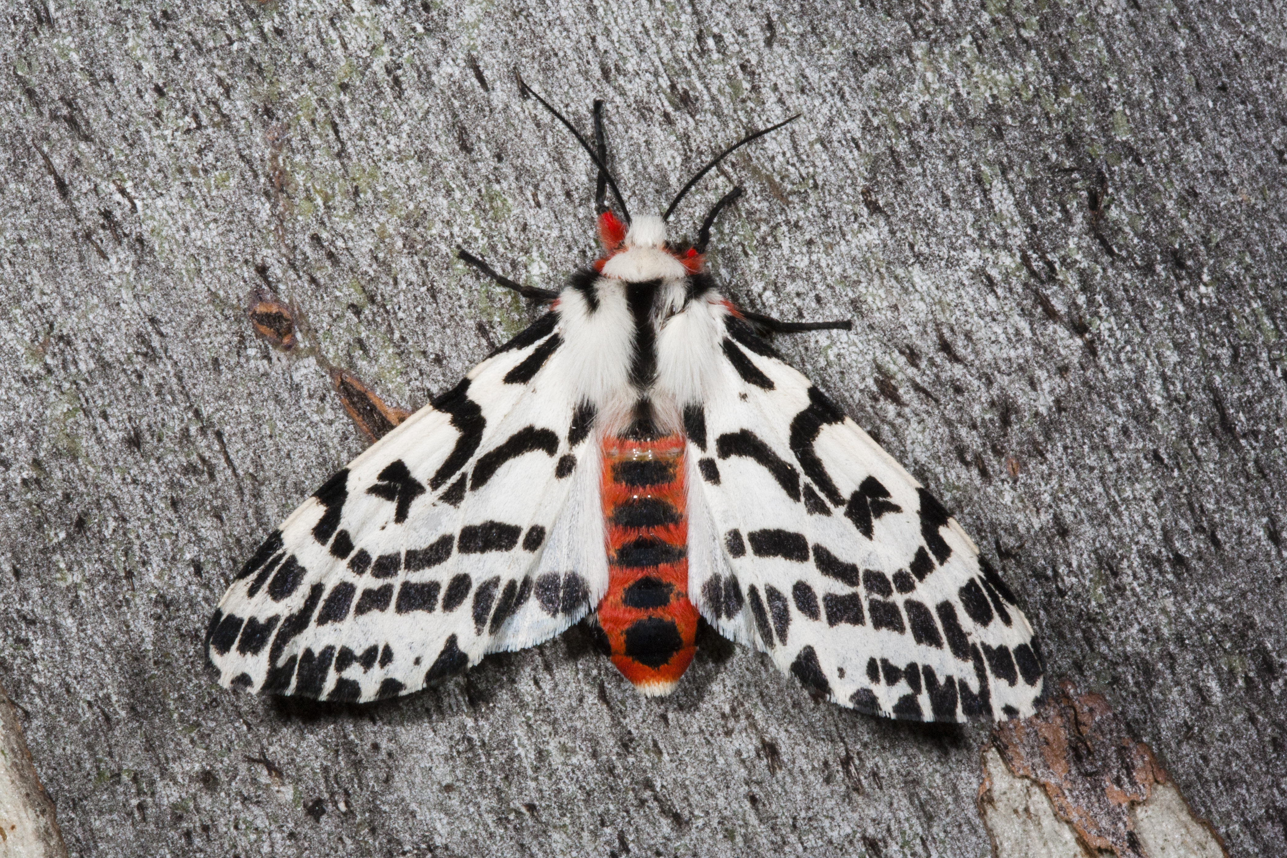 成年虎蛾的翅膀上有着十分引人注目的黑白条纹,以及黑橙相间的腹部。