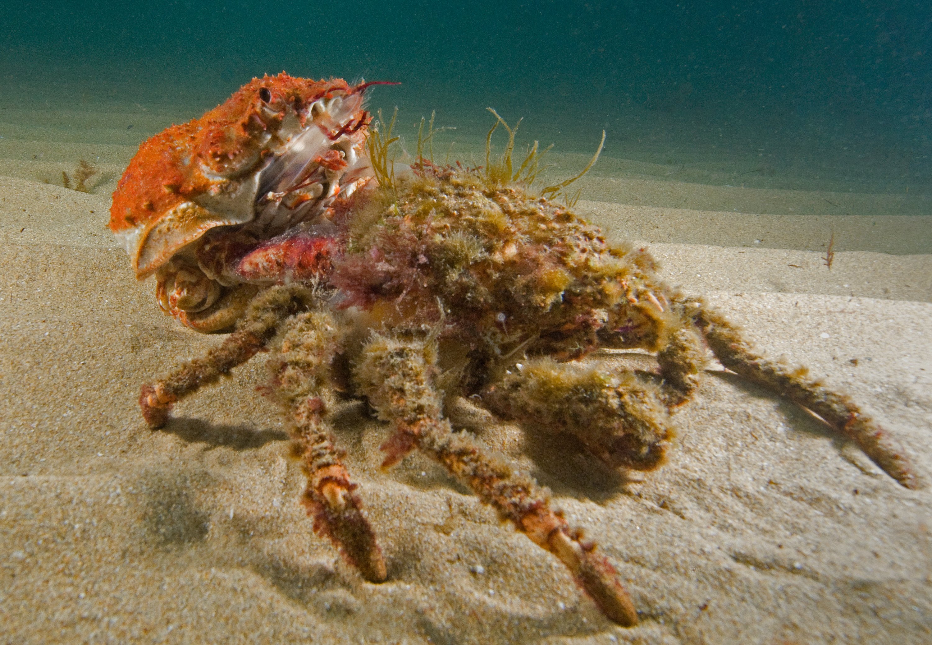 When solitary, these crabs are often hard to spot; algae, sponges and sea squirts set up shop on their shells and provide excellent camouflage. However when the crabs aggregate and march, this hungry army is easy to spot. They scavenge whatever food they can find, including the wildlife on the shells of one another.