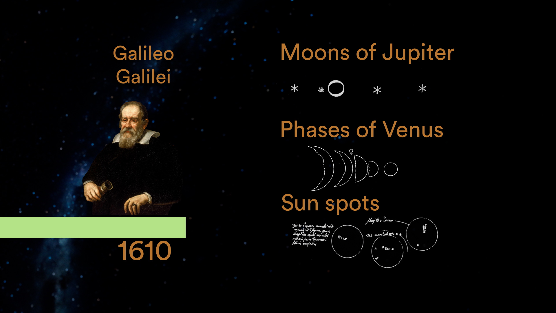 In January 1610, he observed four moons orbiting Jupiter, proving that Earth was not the centre of all motion in the solar system.
