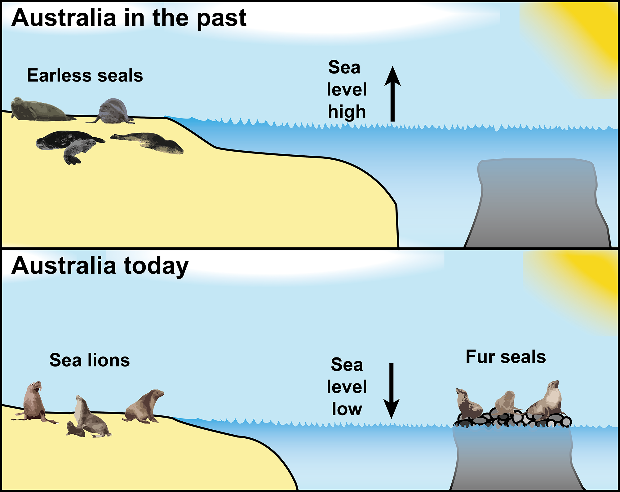 In the past dramatic shifts in the Earth’s climate altered Australia’s environment. The formation of the polar ice caps caused a drop in sea level, eliminating the beaches that earless seals relied upon to rest. This likely meant they either had to leave Australia’s waters, or that they became locally extinct. Scientists think the elimination of shallow water beaches, and the appearance of more islands, resulted in eared seals colonising southern shorelines from the North Pacific Ocean.