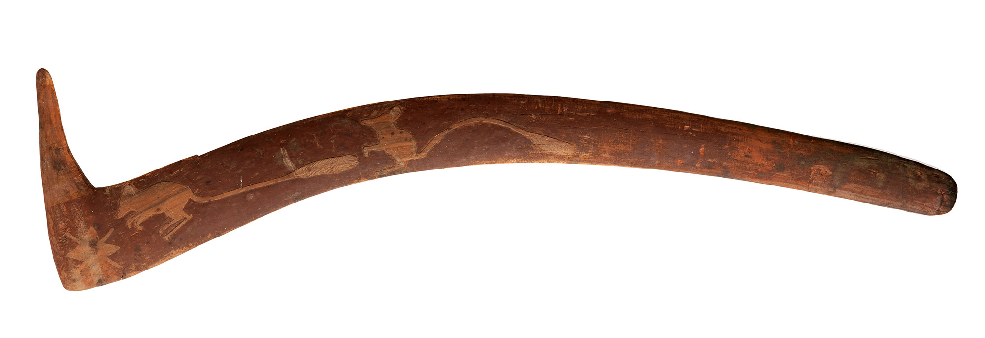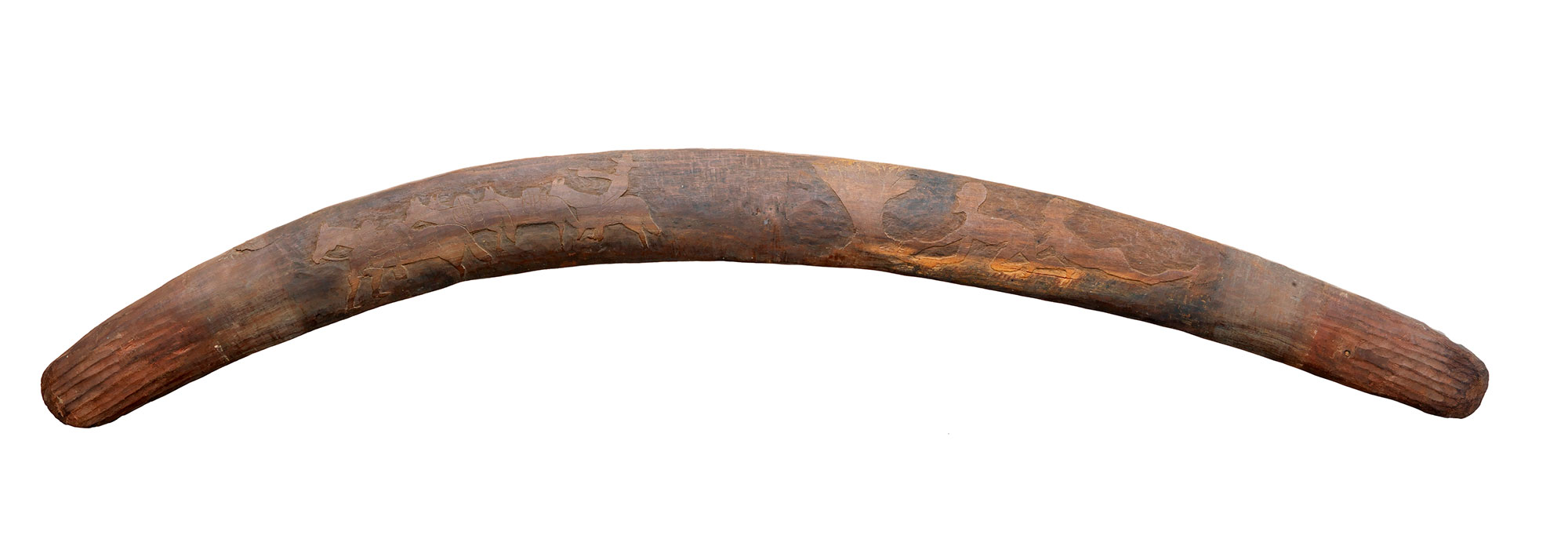 The boomerang was purchased by the museum in 1946 from the estate of Herbert Basedow, a geologist, explorer and medical practitioner who worked in Central Australia and known collector of Aboriginal art. It came with no documentation at all. "It was clear to me from the style that it was Jim Kite's work but I had nothing to prove it," says Jason. He began searching for the proof for the artist behind this boomerang and another, exquisitely carved with hopping mice, from the Basedow collection.