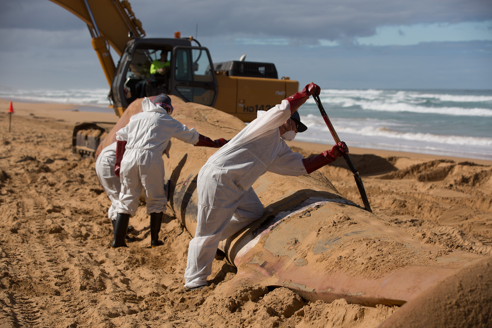 The first step to recovering the skeleton and scientific samples is to move the whale further up the beach away from the waves using two earthmovers.
