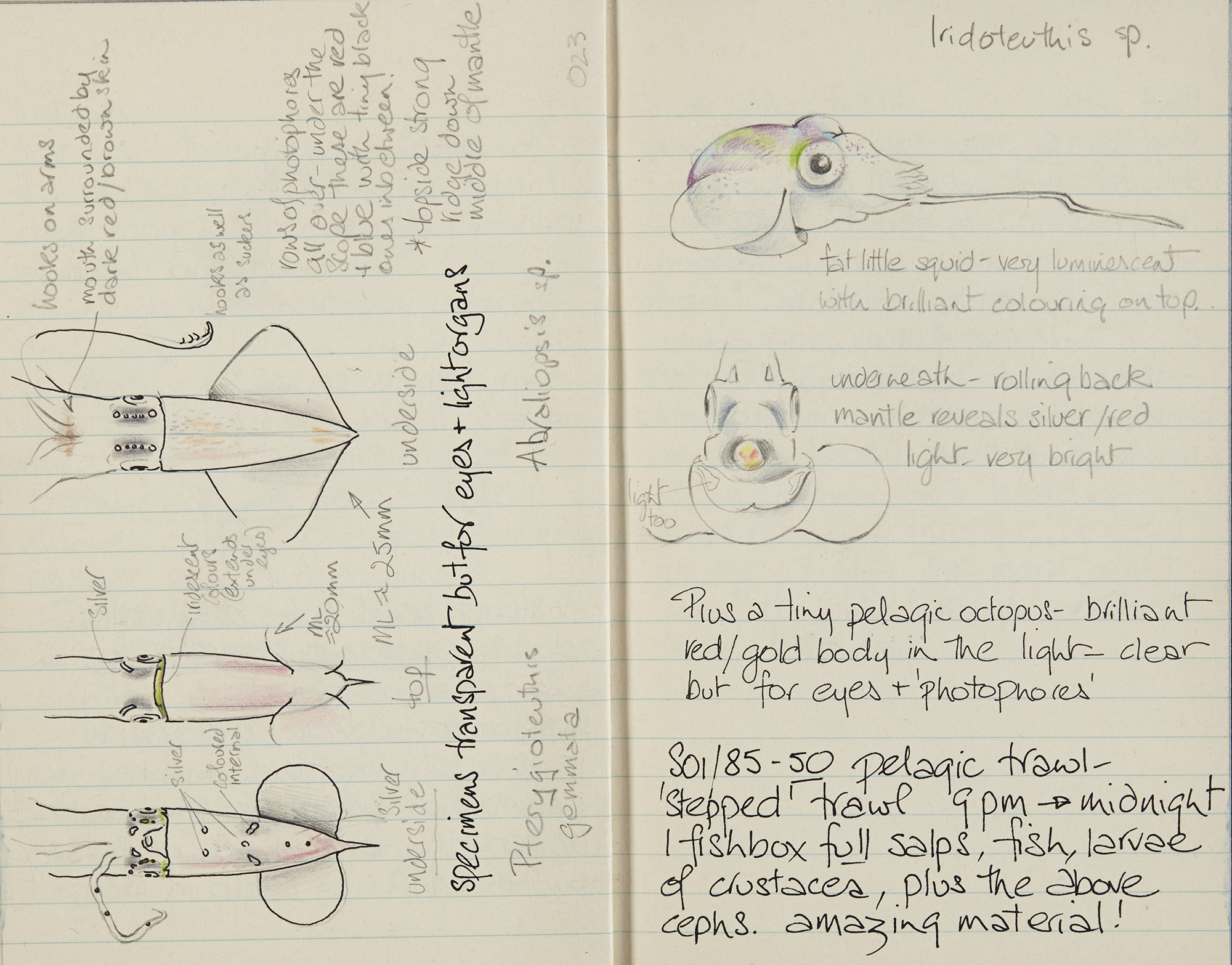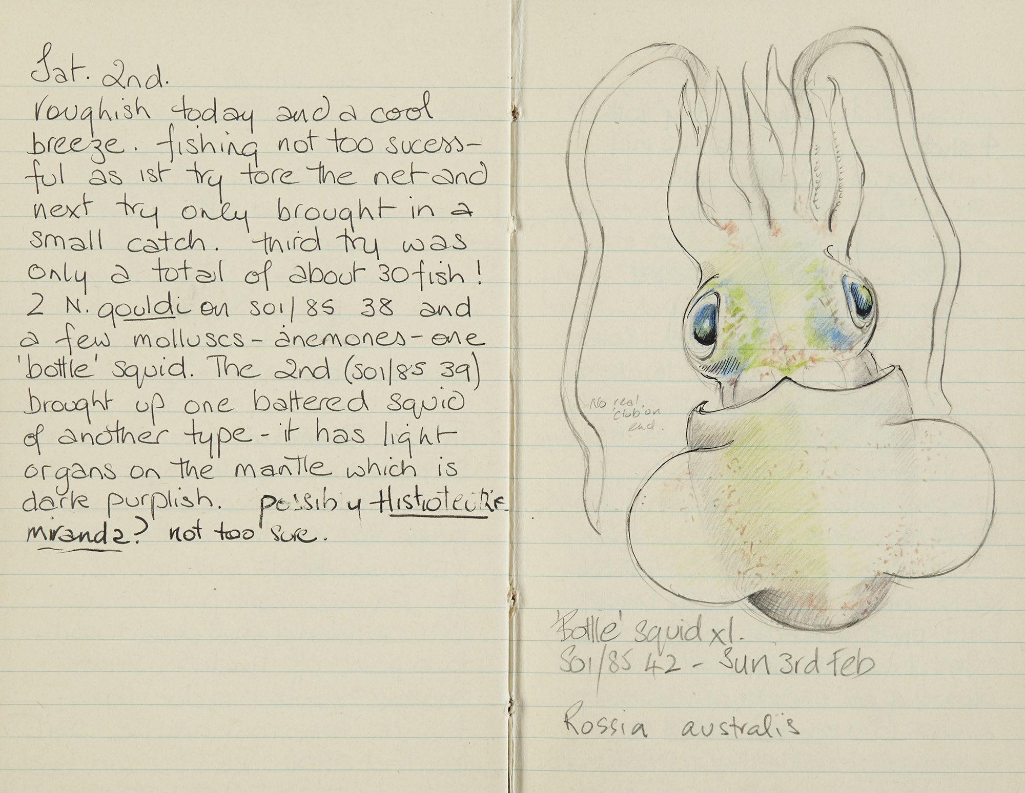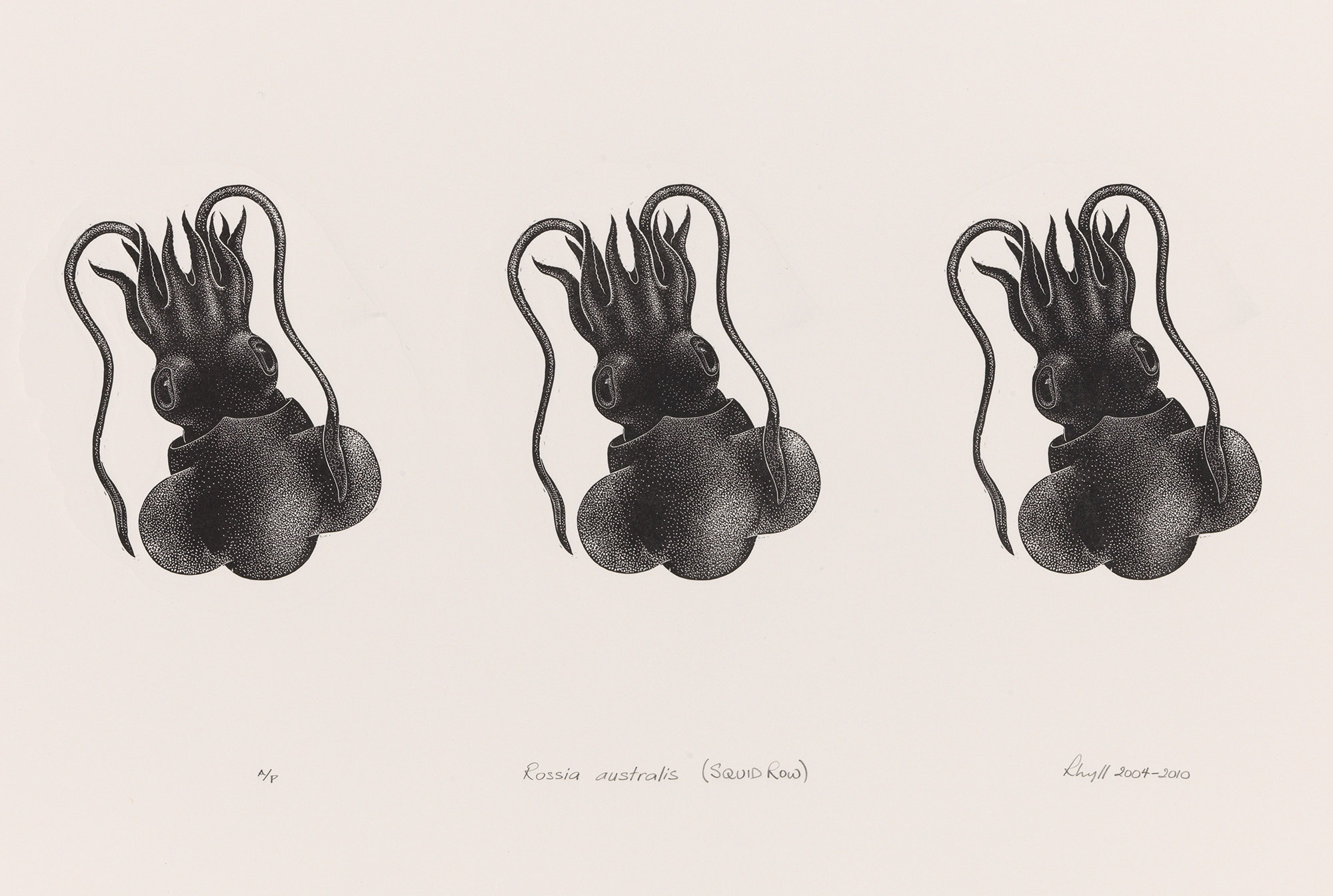 ‘There is a 20 year gap between my 1985 field sketch of Rossia australis and my using it as reference for my 2005 wood engraving Squid Row.