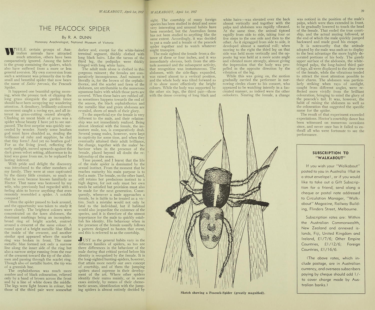 In April 1957, R. A. Dunn, an arachnologist with what is now Museums Victoria, published 'The Peacock Spider' in a precursor of Australian Geographic.