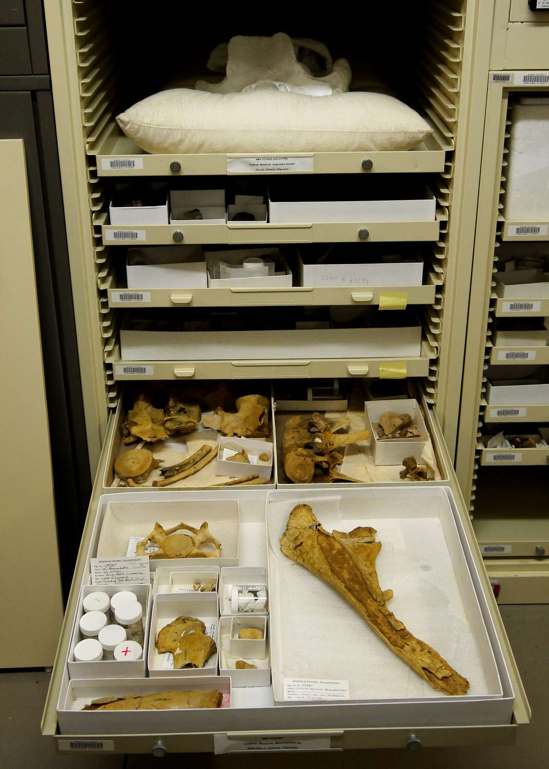 This cabinet contains parts of the skeleton of a fossil whale collected at Bells Beach, on the Surf Coast southwest of Melbourne.