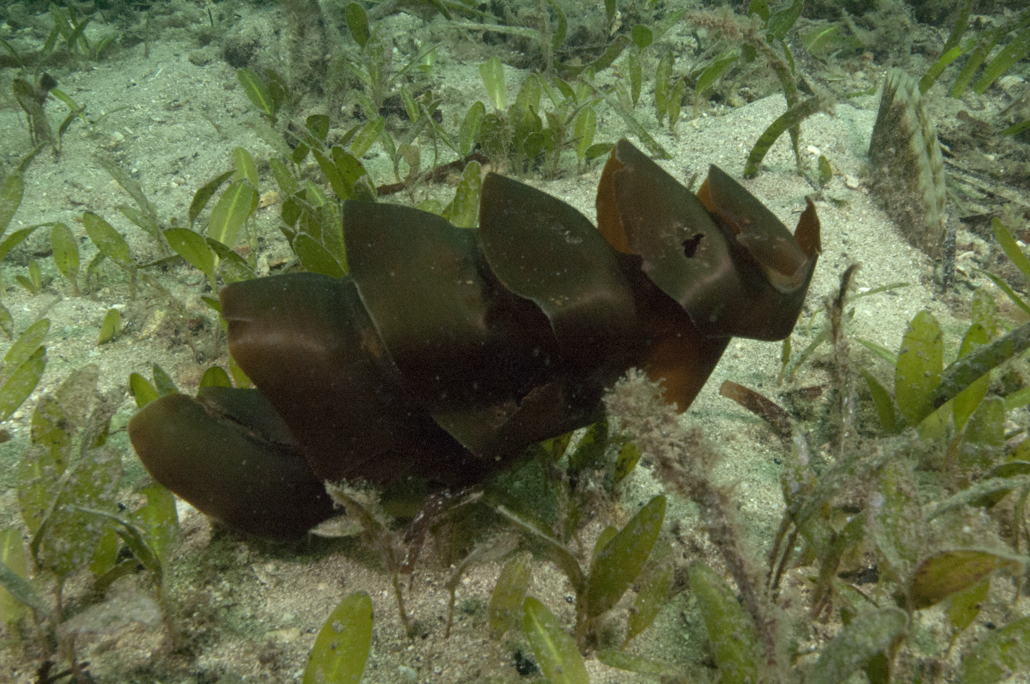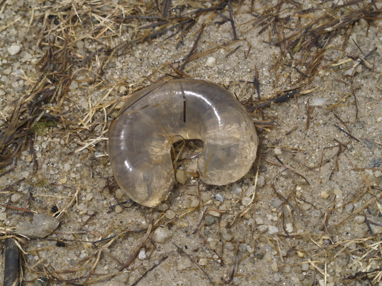 While it looks like a jellyfish, this is the egg mass of a Moon Snail. The snail lays tiny eggs in the stiff jelly, which absorbs water and swells into a distinct, curved sausage shape. The egg mass can be up to 25 cm long—three to five times bigger than the snail that laid it!