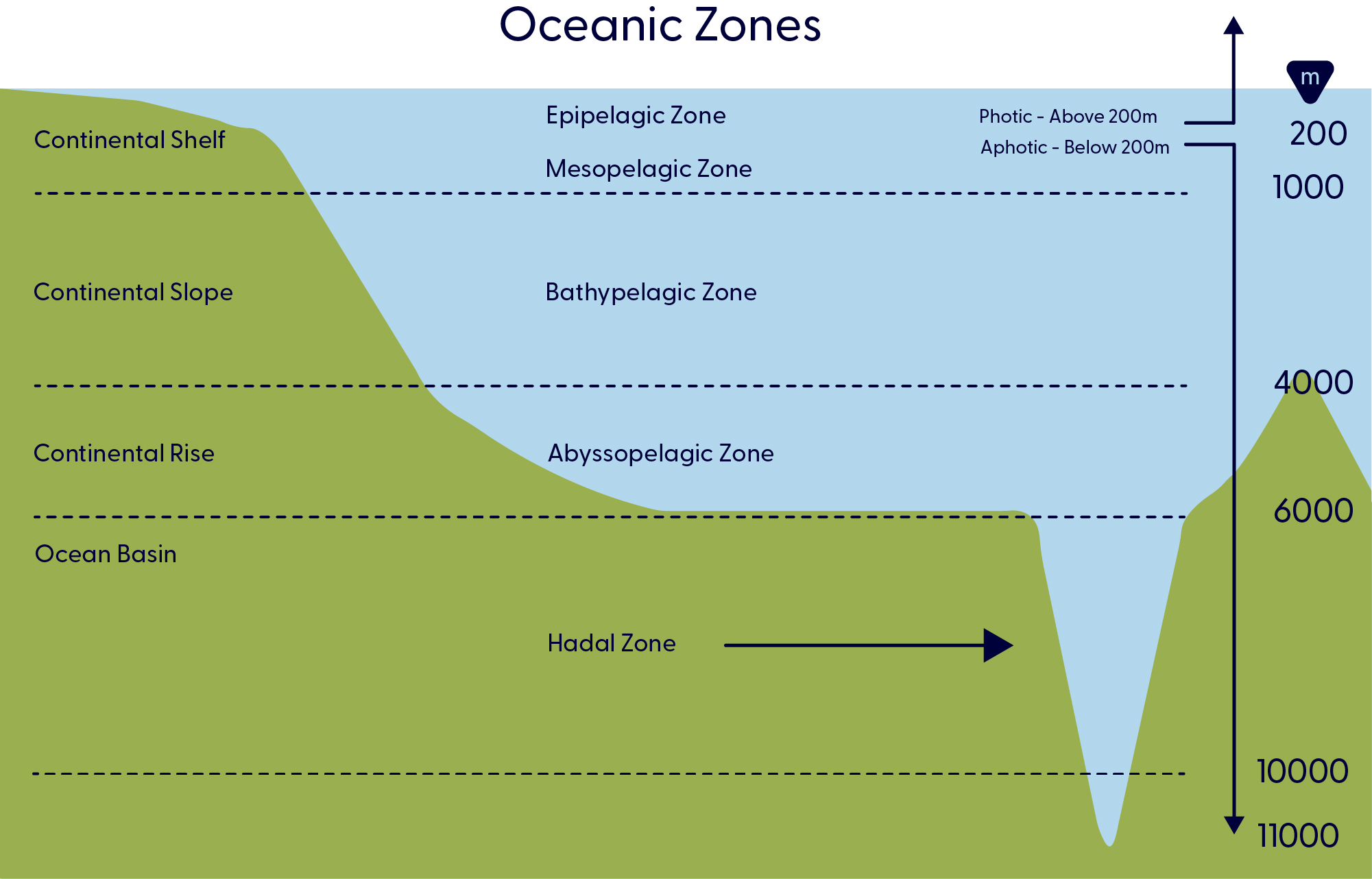 Sink down and pass the 1000 m mark, and it’s total darkness right down to the deepest point of the seafloor, about 11 km below the surface in the deepest parts of the Mariana Trench.
