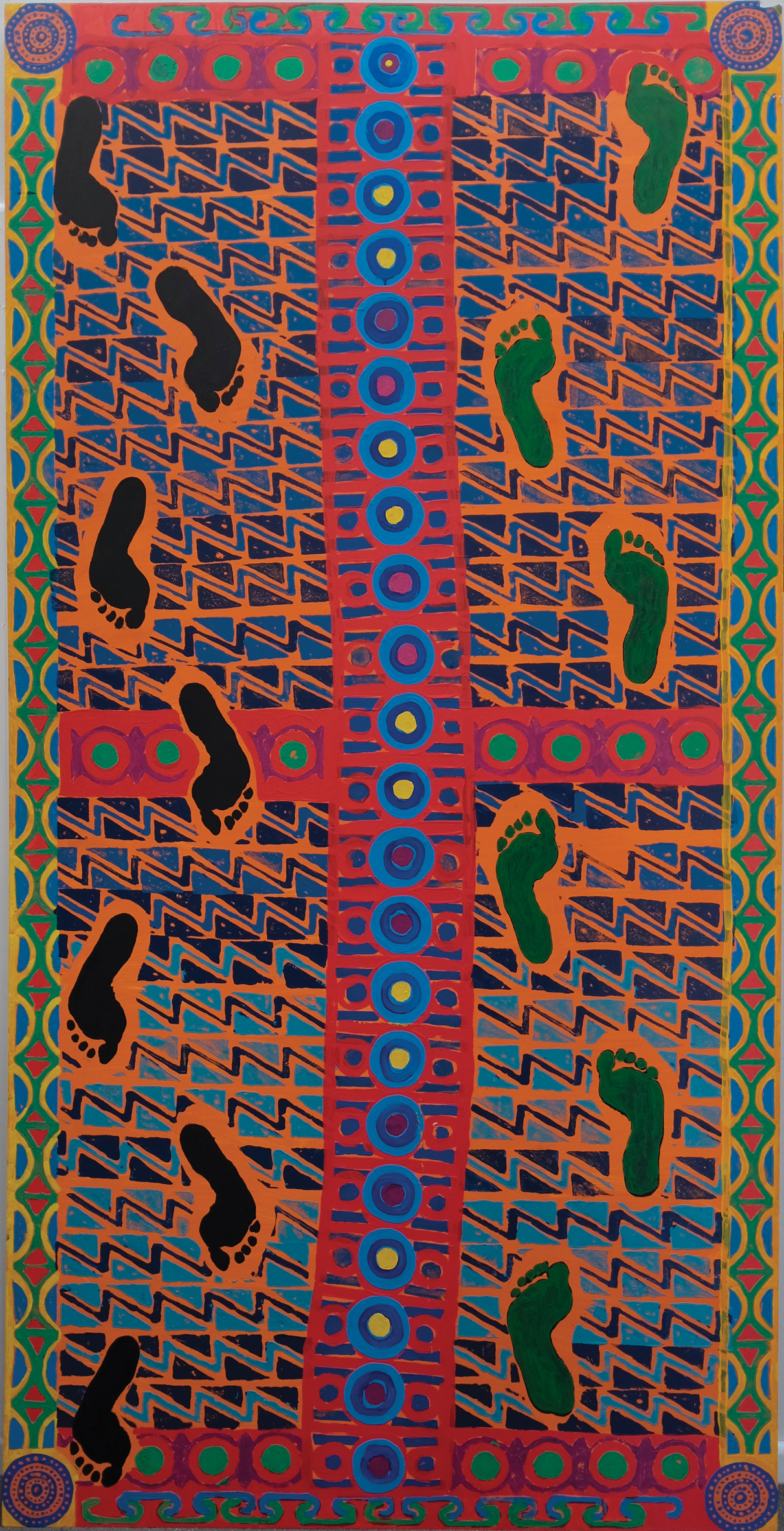 Meeting for the first time in 2013 the group started collaborating on paintings straight away, gradually building relationships with each other and a unique style of working. From this first meeting the group have had many impressive achievements including solo exhibitions and having their work collected by private and public institutions, including the National Gallery of Victoria. Using acrylic paint and creating large cut-outs and stamps the Pitcha Makin Fellas make art that tells stories through bright patterns inspired by the environment, Aboriginal history and historical south eastern mark making.