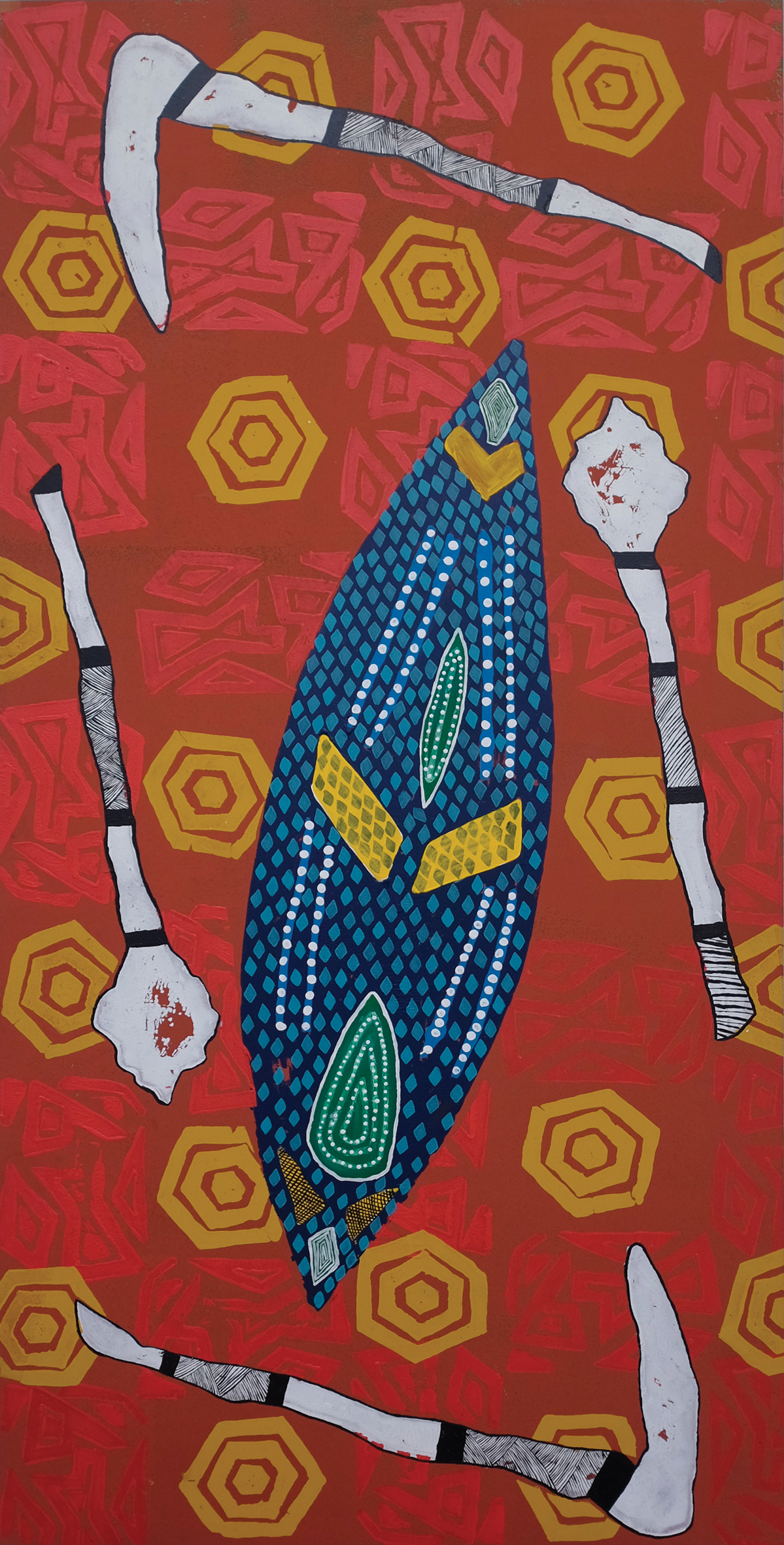 The process of making pictures is completely collaborative with everyone able to contribute ideas and develop different methods to make the artwork. The Fellas see humour and laughter as an important part of making art; tongue-in-cheek titles of the work allude to the histories they are thinking about and encourage the viewer to ‘open their eyes’ to the story unfolding. Although playing with language is a key element to their work, the ideas made visible and stories told have great meaning and honour both the good and the harder stories of Aboriginal history. Ultimately their work is to present the strength and pride that they have in their culture.