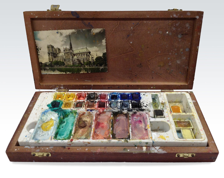 Art case owned and used by Mirka Mora in her art studio in Richmond from the year 2000. The box contains painting materials and a tinted photographic postcard of Notre Dame cathedral taped to the inner lid.