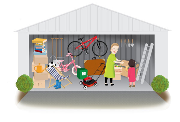 Hannah and her mother in the garage. Books, bikes, a suitcase, a lawn mower, gardening tools are stored in the garage.