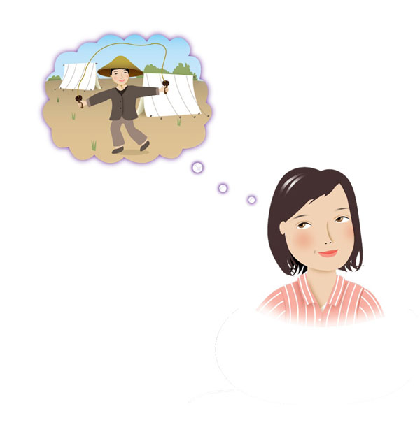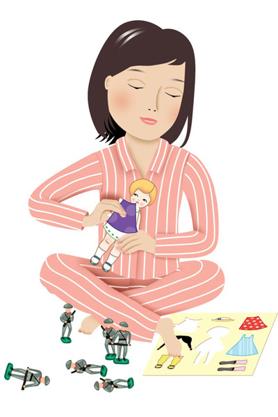 A girl holding a peasant doll with thought bubble of girl holding a doll