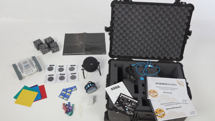 This kit contains a Homestar Flux portable planetarium, a DIY rocket kit with balloon and alka seltzer rockets, four Merge Cubes, and a Sphero RVR robot. The kit also contains an activity guide with a broad range of programs you could run for all ages.