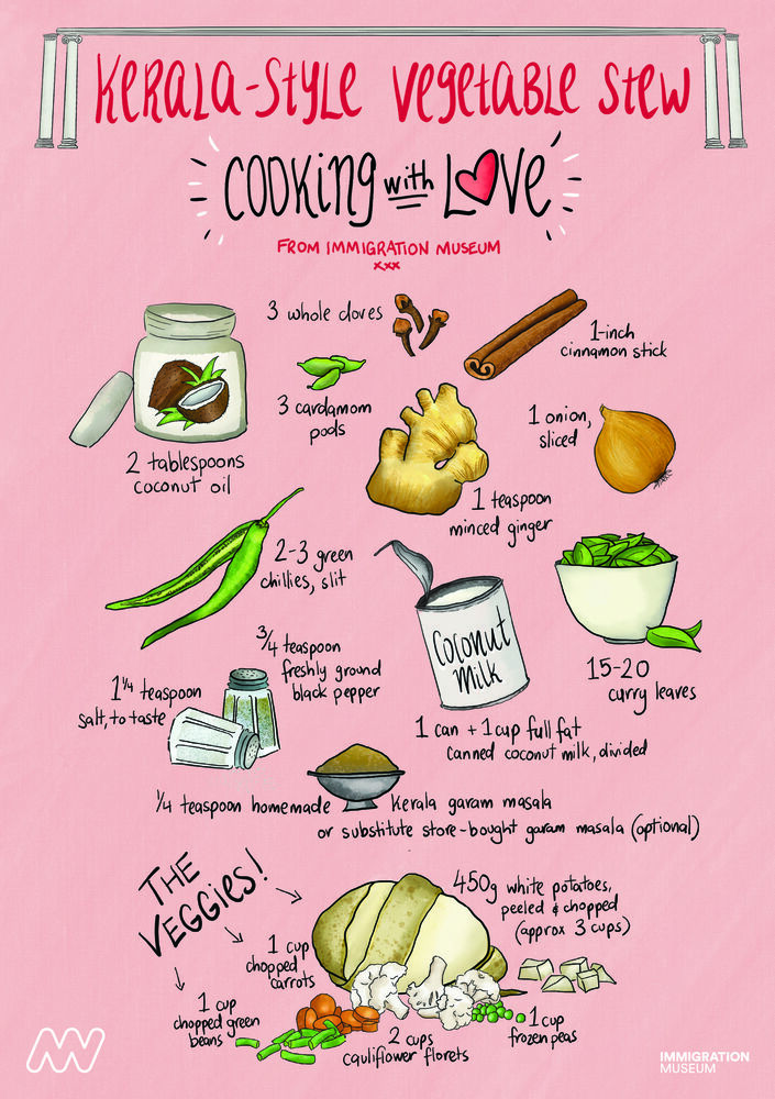 "This stew is very nostalgic for me. Growing up, my family and I cooked stew with appam for breakfast at least monthly, but it is rare to find in Australia. It is also eaten during the Onam festival, just passed. In Kerala, Onam is observed with flower rangoli, music, dance and traditional food. This year, most celebrated with their own families, or held festive lunches over Zoom!"