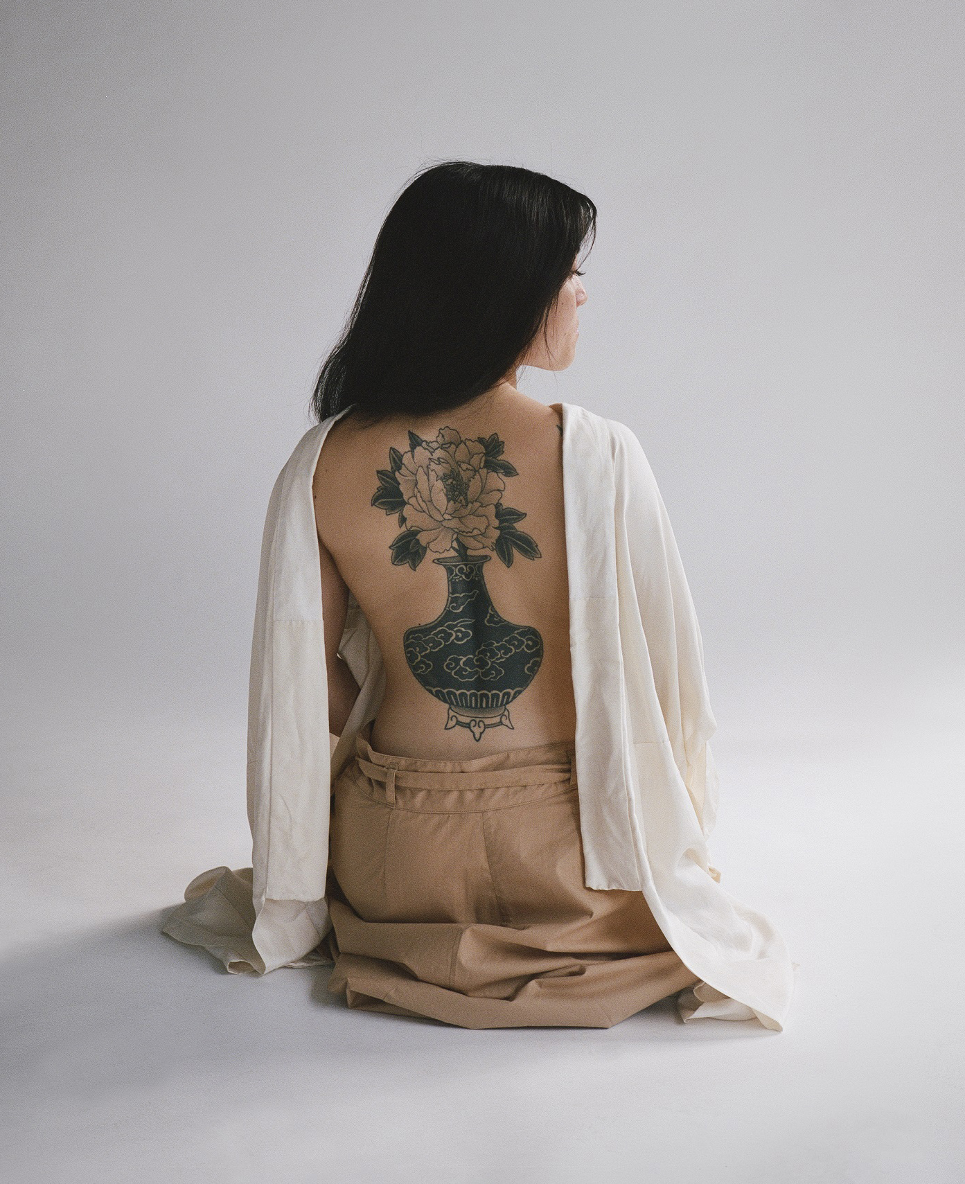 This photograph by Lekhena Porter is from an installation by Stanislava Pinchuk, Documenting the Body, which presented curated work by Australian tattoo artists as part of a broader suite of exhibitions, Our Bodies, Our Voices, Our Marks. Here, Vanessa shows her tattoo of a Chinese vase with peonies, by artist Paul Stillen.