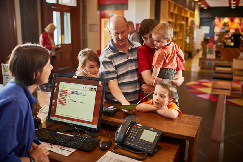 I will walk into the museum and I will be in a large room called the foyer. The ticket desk is in this room, and here we will buy our tickets to get into the museum. I might have to wait patiently behind other people, but we will get our turn. After we buy our tickets, I can go into the rest of the museum. The museum staff member at the ticket desk will give my adult a map so they know where to go.