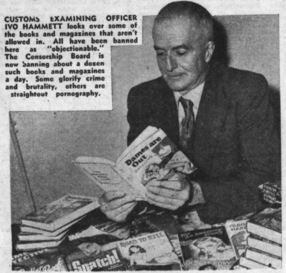 'Mr Ivo Hammett, Melbourne's literary examining officer, had his table piled high with the day's intake - dozens of crime and sex magazines, German sunbathers, English horror stories, Forever Amber in German, Love Me Sailor in French.