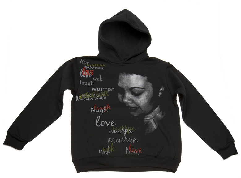 Kat Clarke printed her hoodie with the western Victorian Wergaia language words wek (lives), wurrpa (loves) and murrun (laughs) to express her pride and pleasure in who she is.