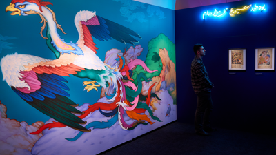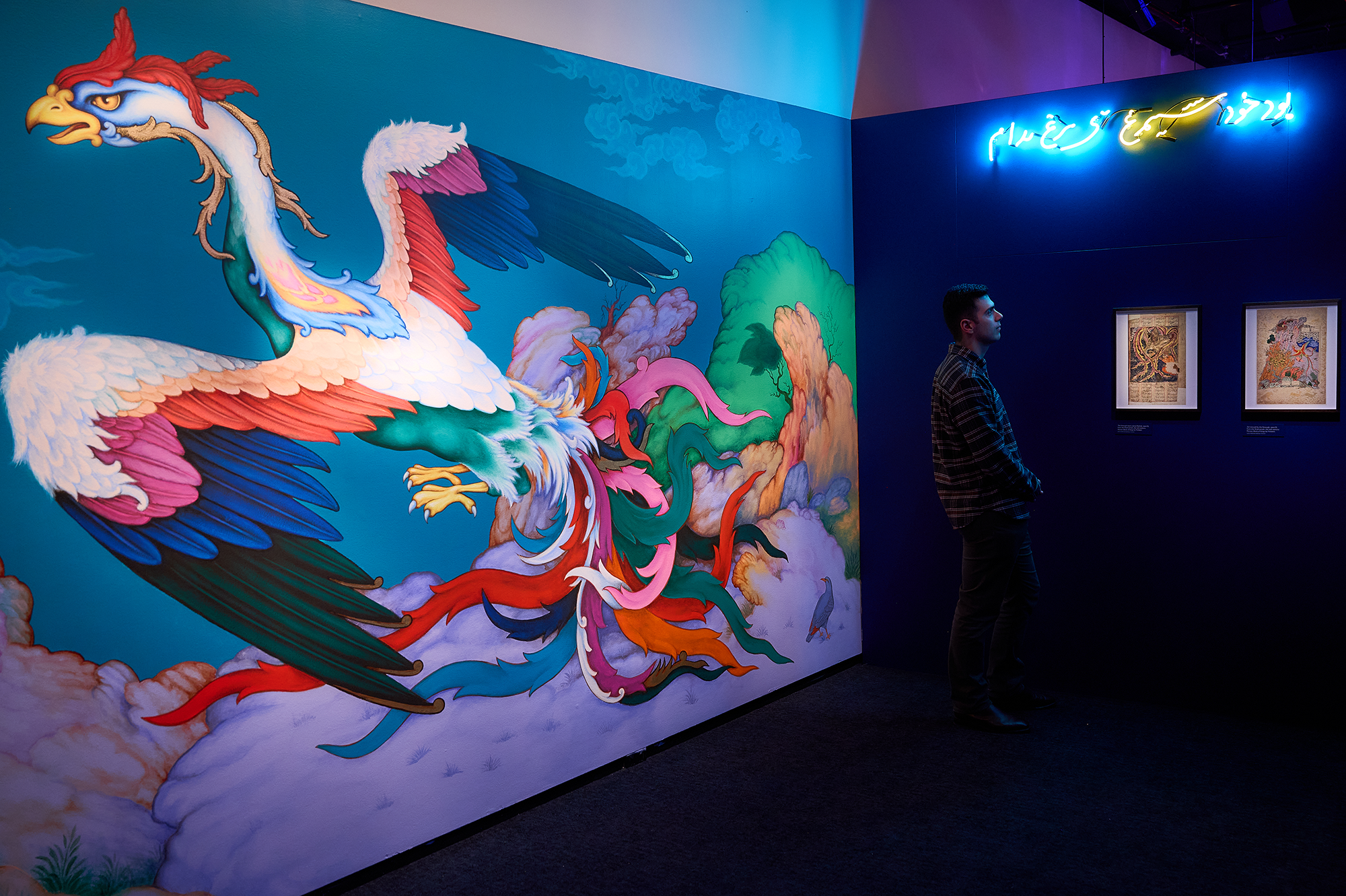 Afghanistan-Australian visual artist and poet Elyas Alavi and Sher Ali explore resilience, strength and the joy of being connected in a large-scale mural and neon text, illustrating the story of the Simurgh, a Persian mythical bird.