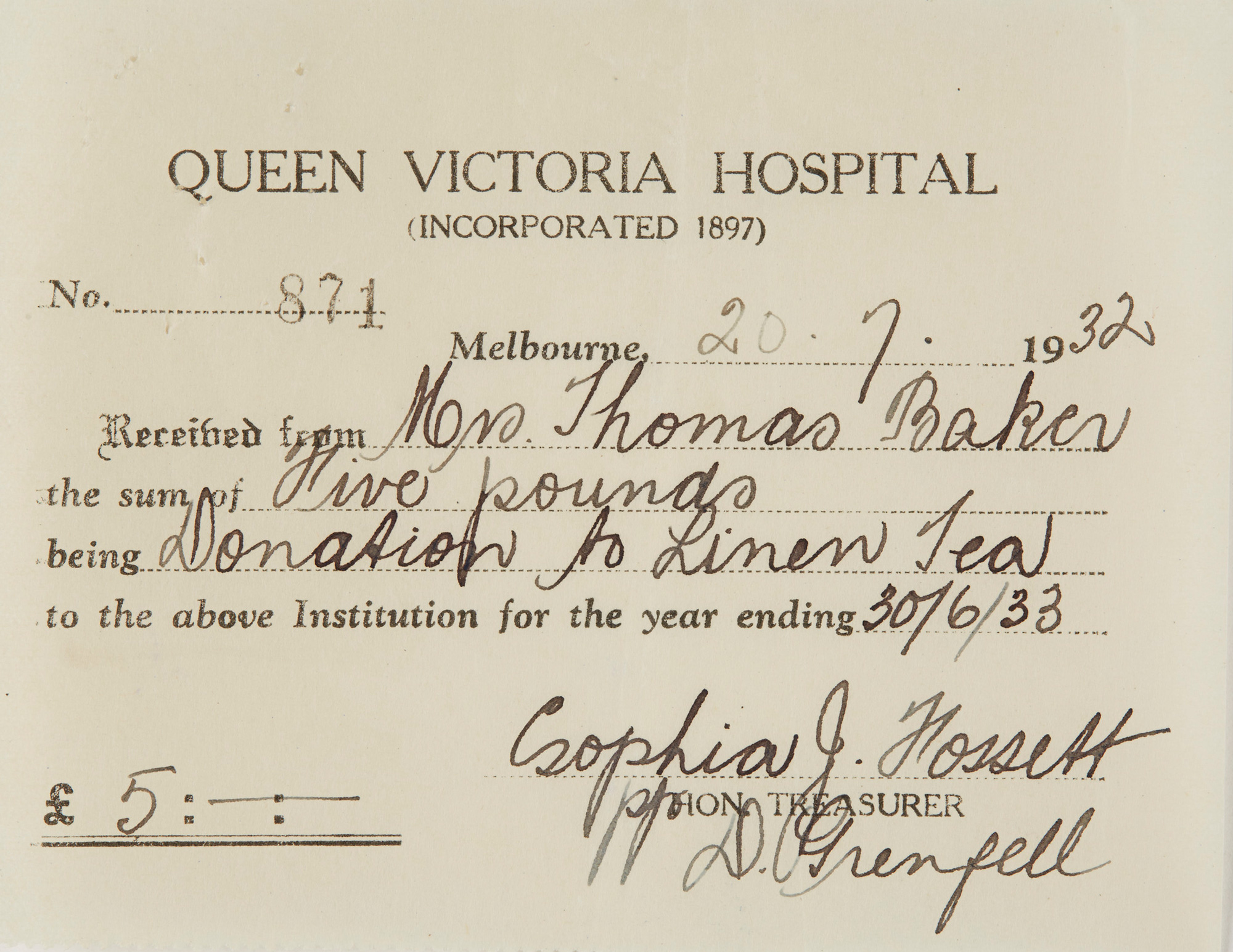 She generously gave her time and her money to a wide variety of clubs and charities, and in 1933 was awarded a CBE (Commander of the British Empire) for her services to Victoria.