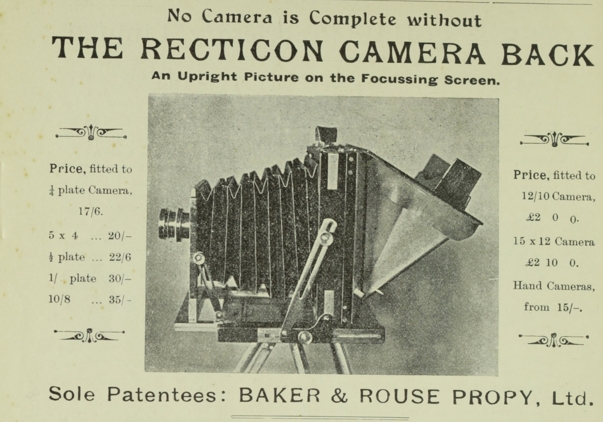 Baker & Rouse had more luck with innovative camera parts. In 1900 Baker registered a patent for a Recticon camera back to give “an upright picture on the focussing screen”, which found a market amongst Australian photographers.