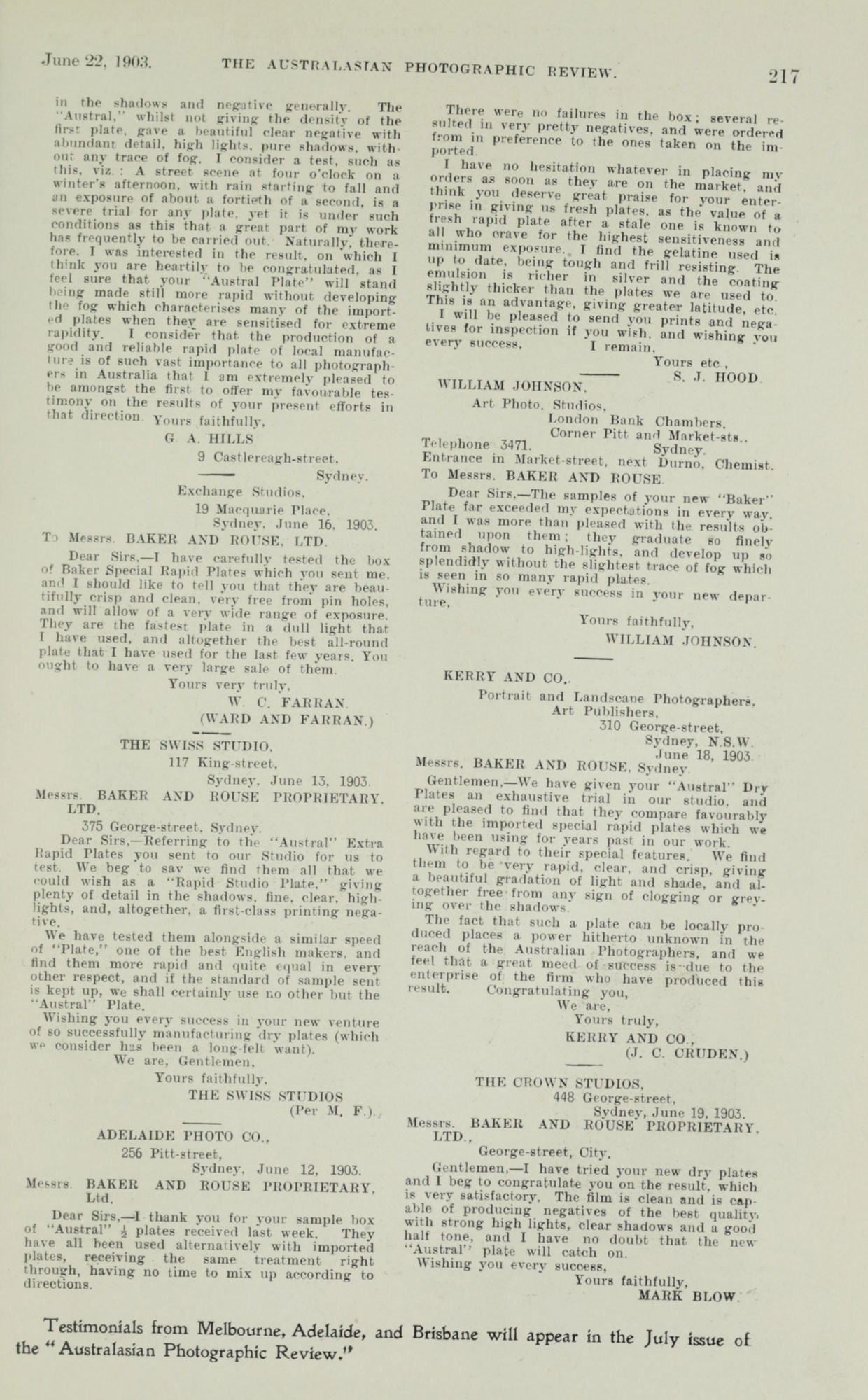 Their testimonials were then featured in the magazine that Baker & Rouse published, the Australasian Photographic Review.