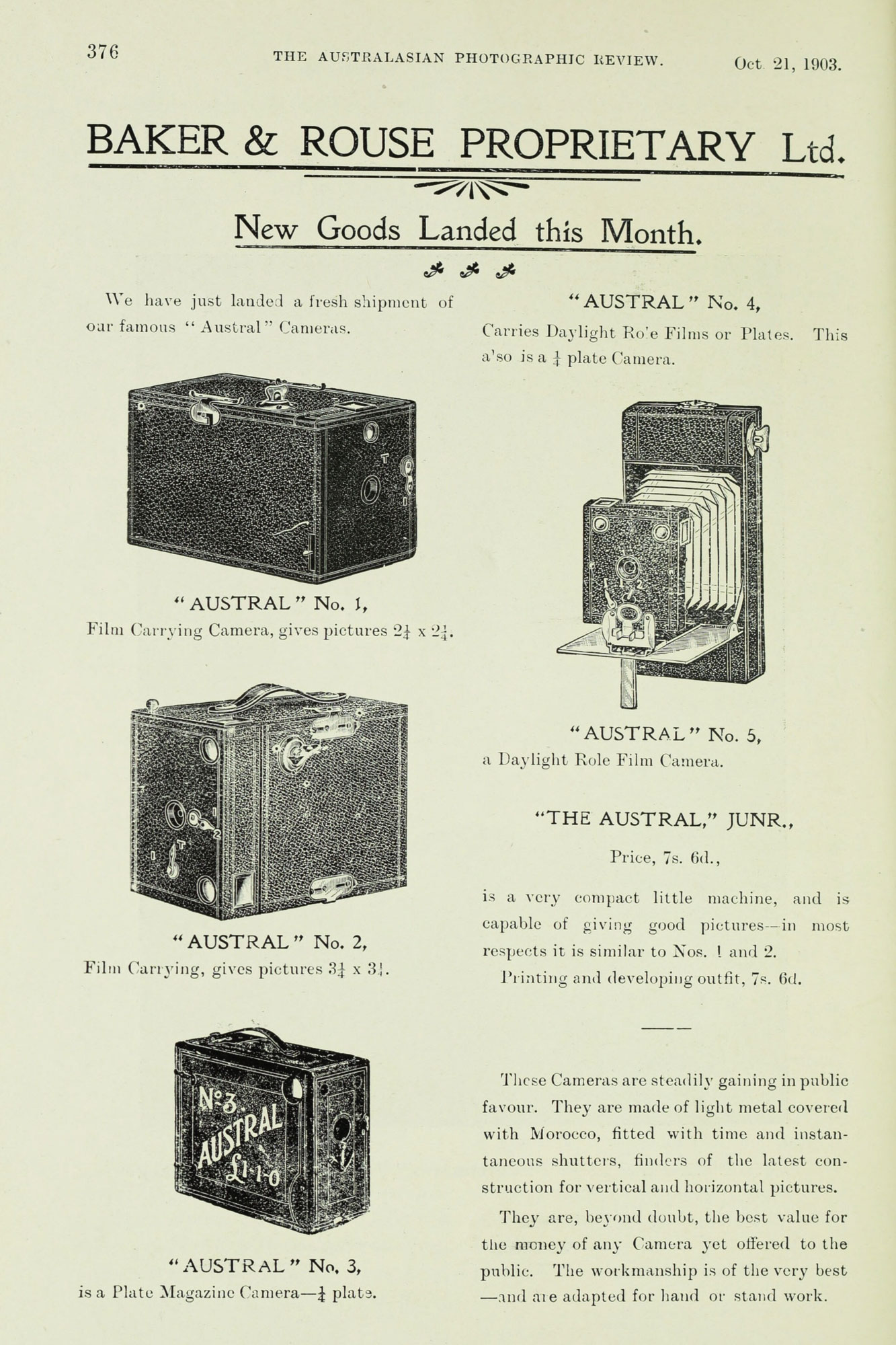 In 1903 they sold a range of at least five Austral cameras, which were built to their order. No 1 and No 2 cameras were roll film box cameras, while No 3 was a plate magazine box camera. No 5 camera was a folding camera.
