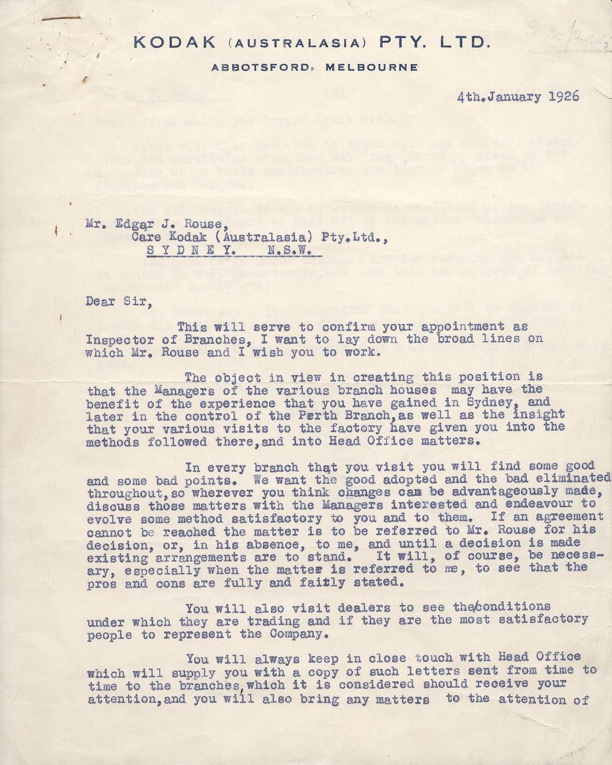 In 1908 or 1909, while still a school student and about fourteen years of age, Edgar began doing some work at Kodak Australasia in an informal capacity, learning what might be considered the family business. His father JJ Rouse was one of the two Kodak managing directors and had been one of the founders of Baker & Rouse, the business that merged with Eastman Kodak to form Kodak Australasia.
