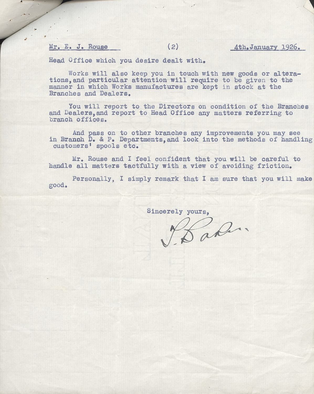 Thomas Baker wrote to Edgar in January 1926, commenting that “Mr Rouse and I feel confident that you will be careful to handle all matters tactfully with a view of avoiding friction.”