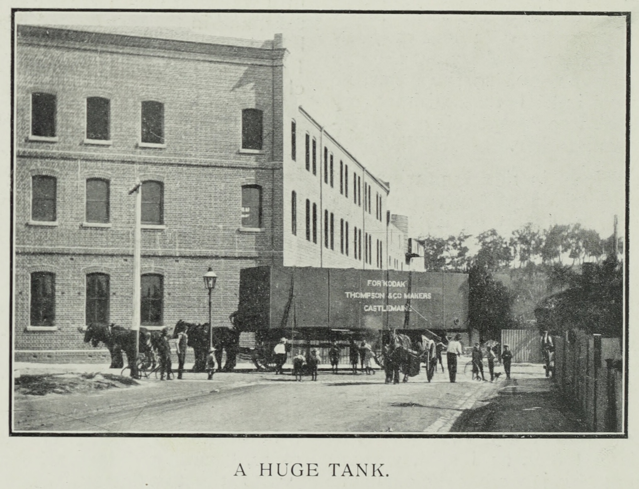In 1909 Australian Kodak Limited hauled a huge 11 tonne iron tank that could hold 20,000 gallons of liquid – from Thompson & Co in Castlemaine – and installed it in the factory. It was 30 feet long, 10 feet high and 8 feet deep.