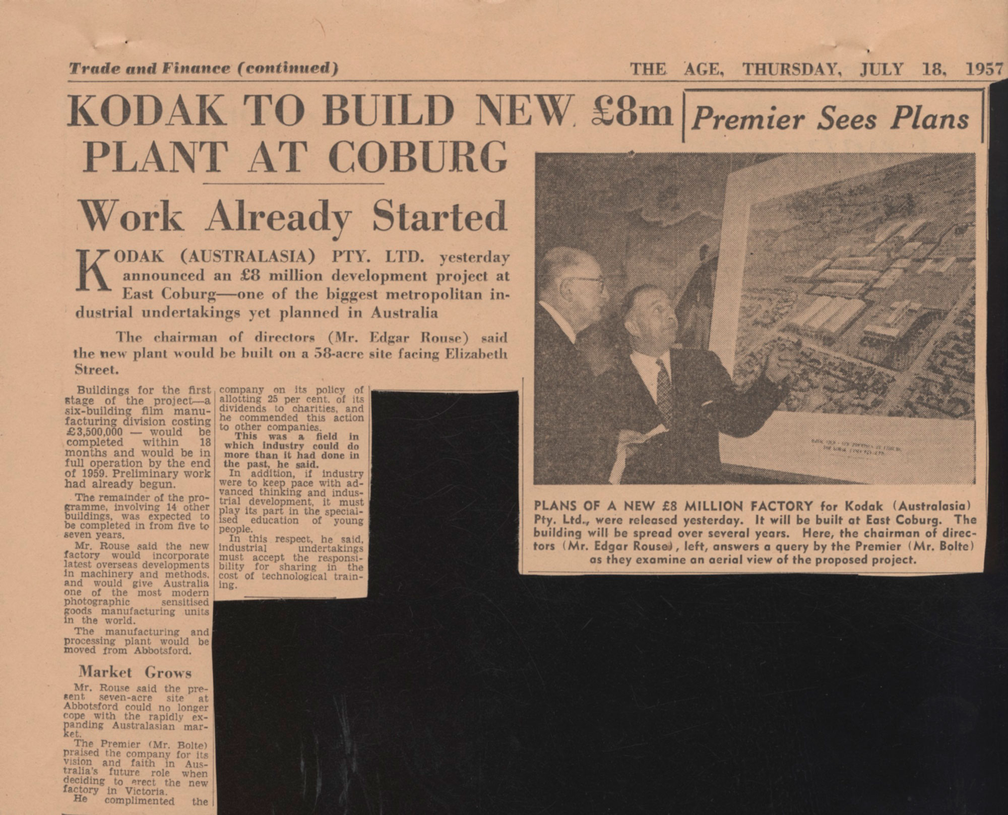 “Our seven-acre Abbotsford site can no longer cope with the rapidly expanding Australian market. We have decided, therefore, to move to a new 58-acre site in East Coburg and to erect thereon a photographic materials manufacturing plant which we believe will be the most up to date in the world, and among the largest in terms of output ... We are proud, therefore, to be able to play a part in the surge of development that is so evident in Australia today."Edgar Rouse