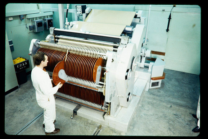 Built in the late 1950s-early 1960s, in the era of the Space Race and Cold War, stepping inside the control room for the Emulsion Coating Machine must have felt like stepping into a spaceship. With highly technical buttons and control systems, Coburg’s emulsion facilities – located in Buildings 2 and 3 – included “kettles”, large film rolls and a coating machine and was the only facility of its kind in the Southern Hemisphere. The coating machine itself was so large that it occupied almost an entire room in Building 3.