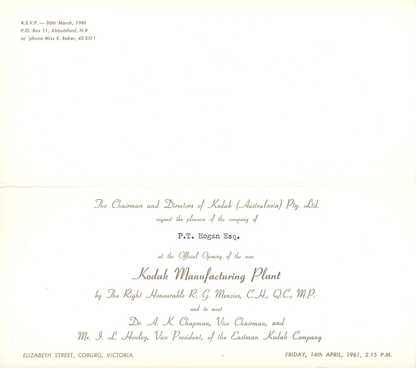 When Prime Minister Sir Robert Menzies visited Kodak Australasia’s newly constructed Coburg factory to officially celebrate its opening in 1961, he delivered the Official Opening speech, in which he declared: