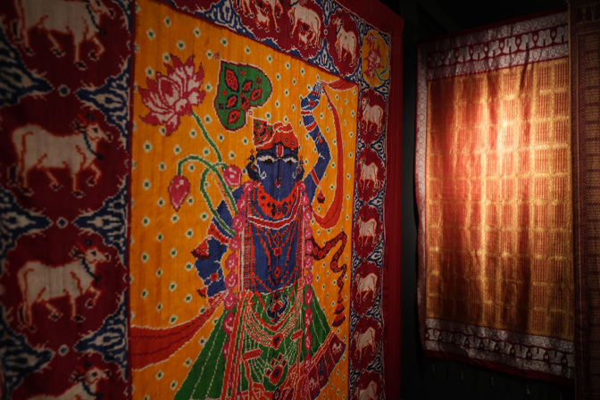 ‘Patan Shreenathji’ by Gaurang Shah is a handwoven silk patola sari that features the likeness of Hindu God Krishna. Traditionally Krishna’s depiction in woven fabric is uncommon, making this double ikat textile a rare exception. Displayed as a wall hanging, the piece took five years to create from dyeing to the finishing stage.