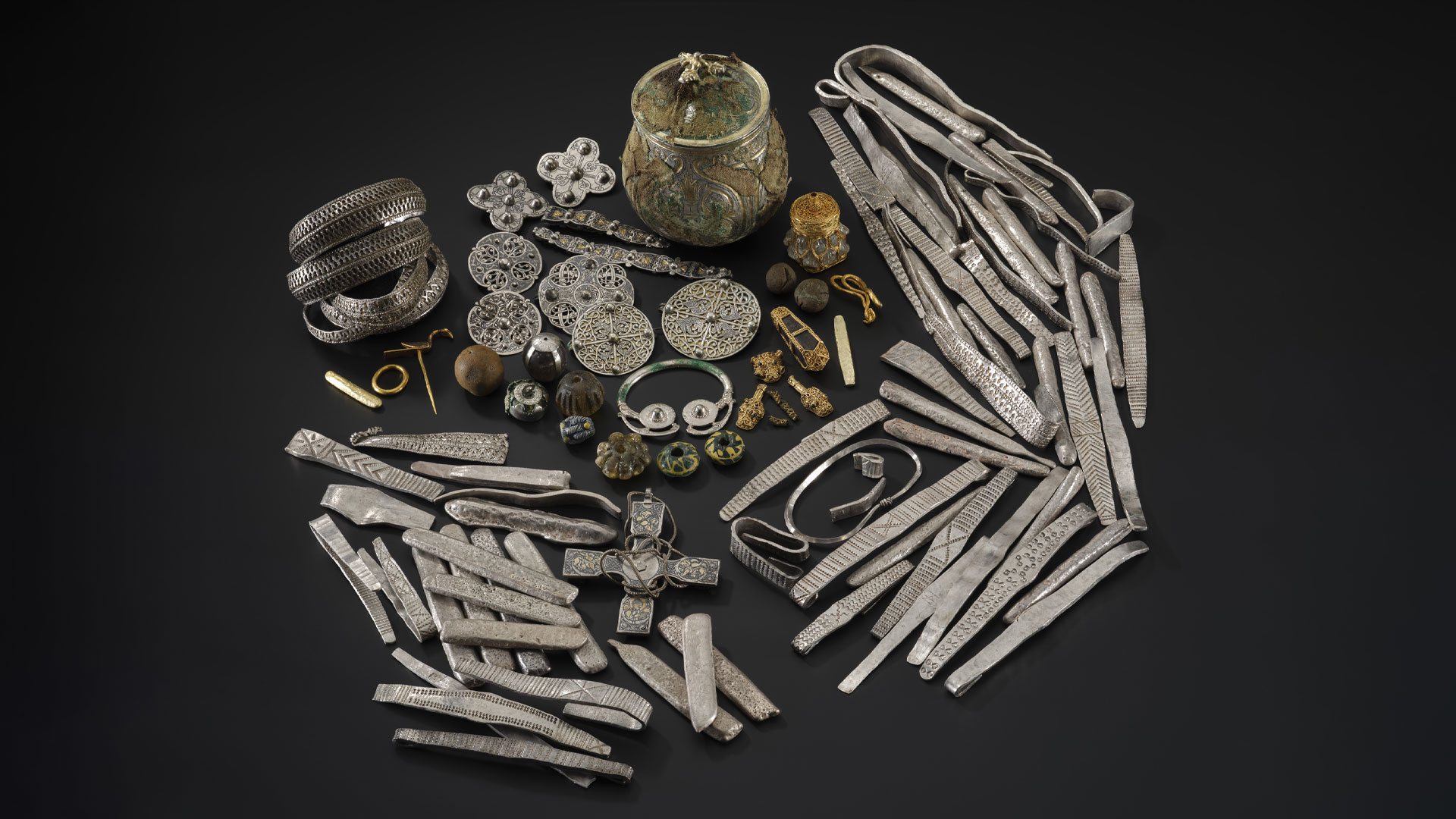 Found in four distinct parcels, the Hoard contains over 5kg of silver bullion, gold, rock crystals and textiles, with many of the objects never seen in Britain and Ireland before. The rich collection of treasures offers a tantalising glimpse into the people, culture, trade and political structures of early medieval Europe and connections with the wider world.