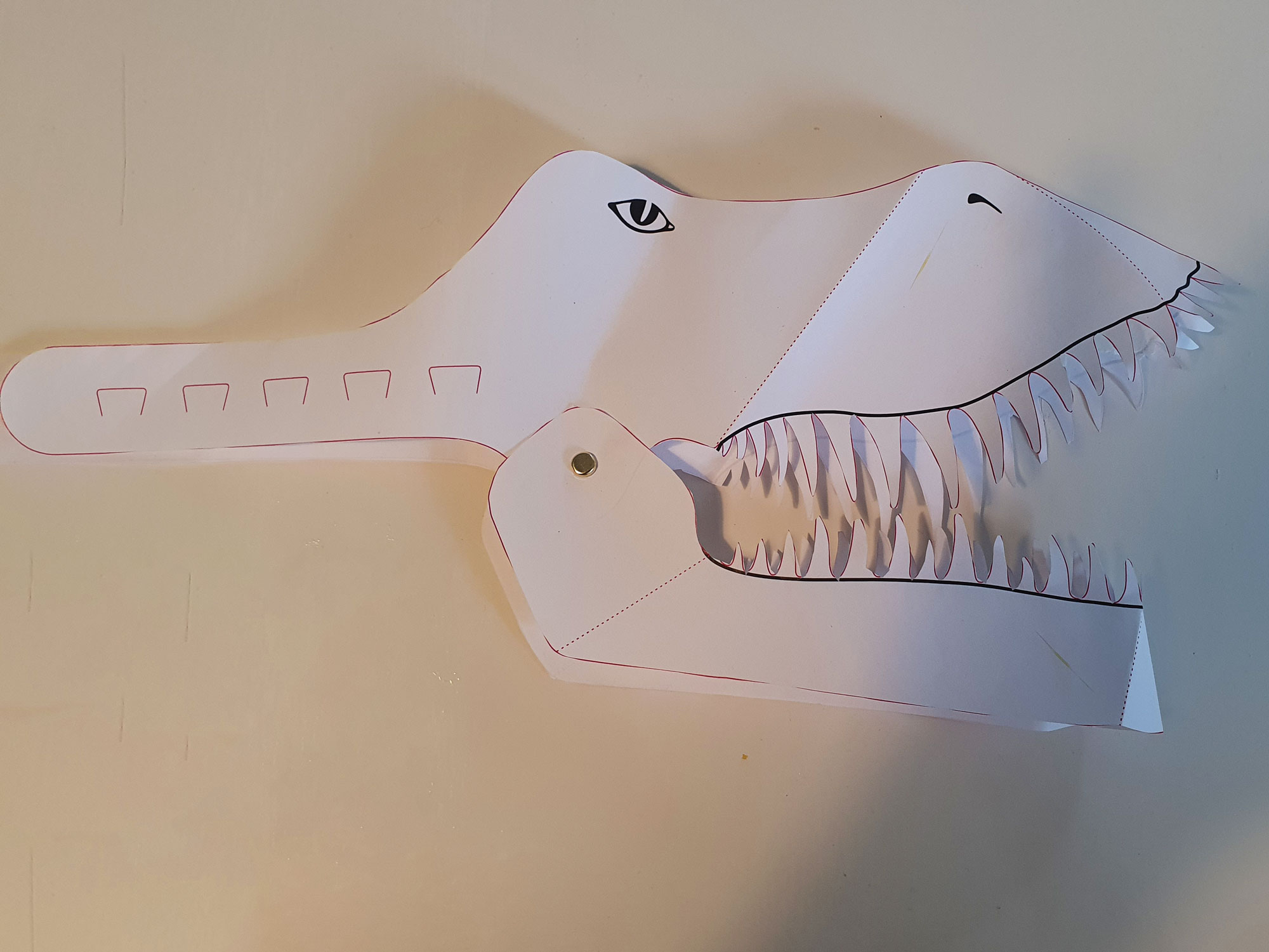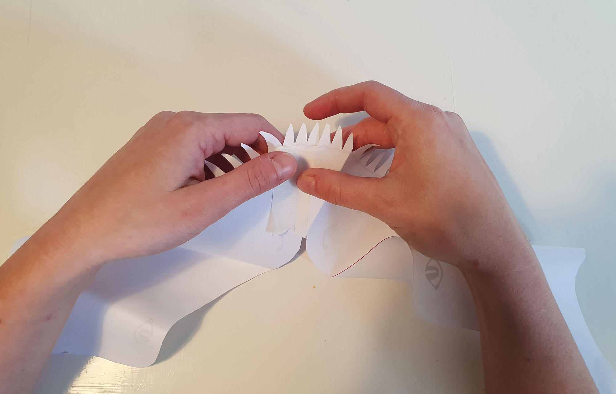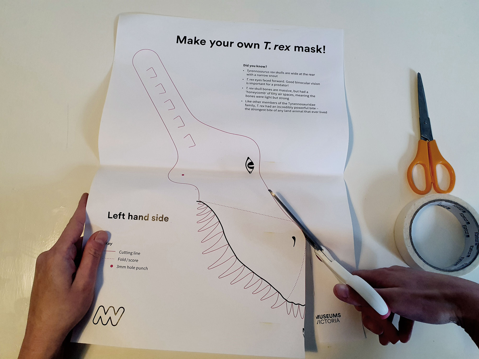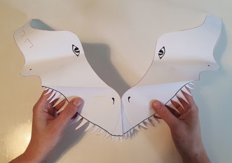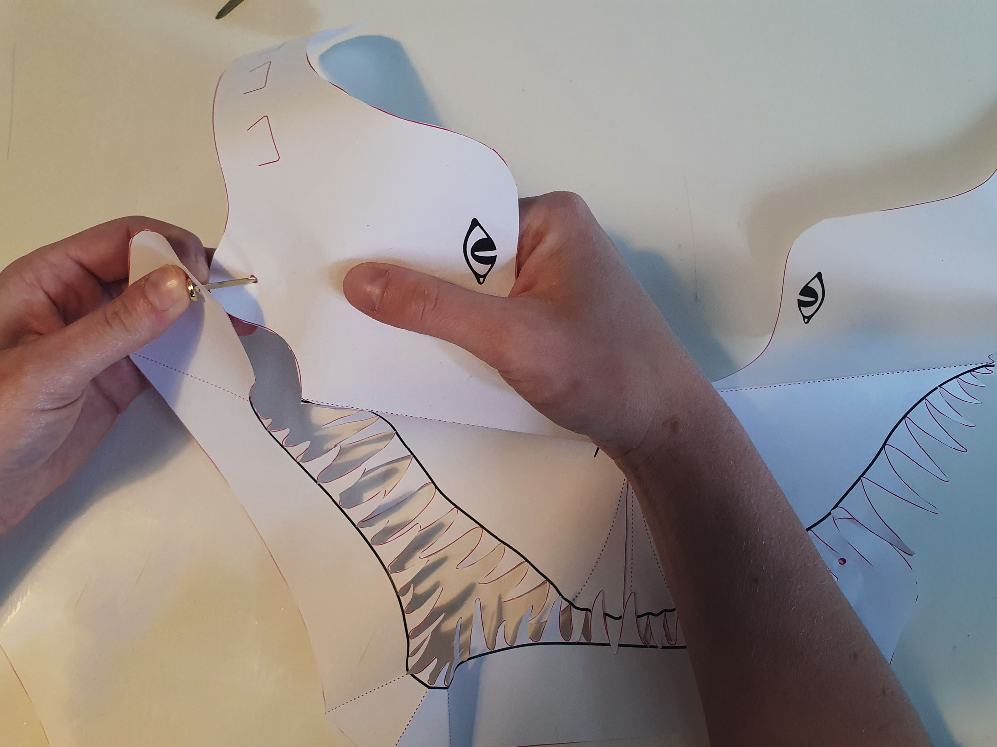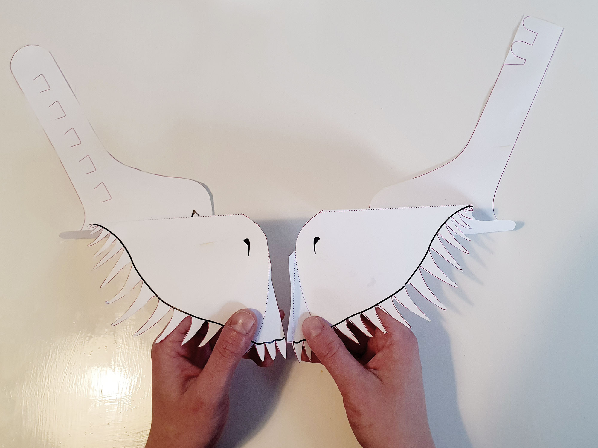 3. Carefully connect the ‘left hand side’ and ‘right hand side’ of the T-rex mask using sticky tape across the overlapping tab on the nose of the mask.