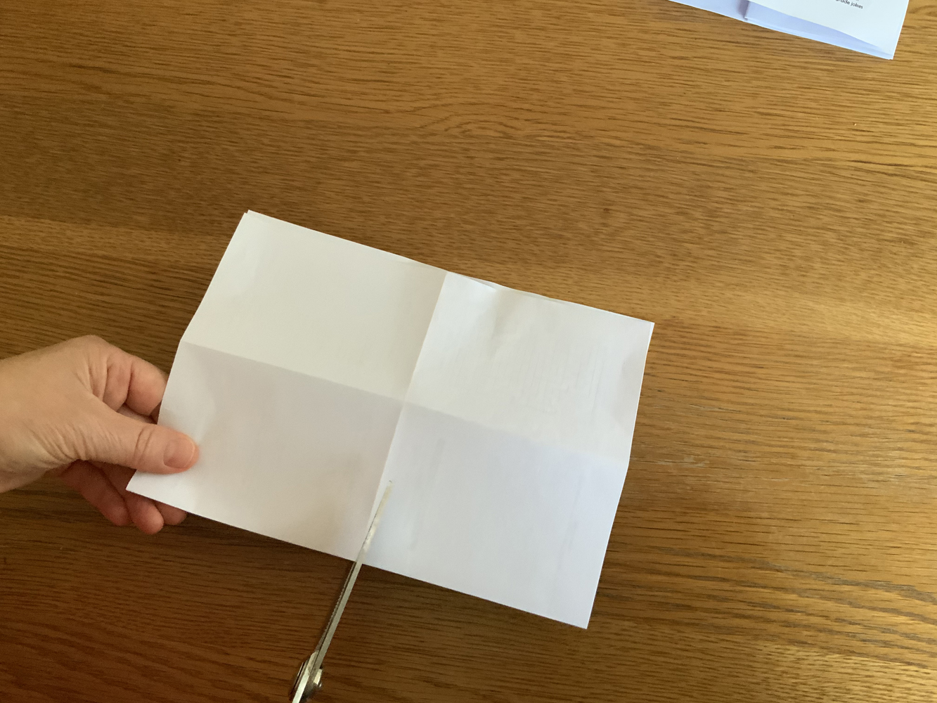 5. Unfold and then fold in half width ways – press down firmly. Make sure you get a grown up to help you when using scissors: