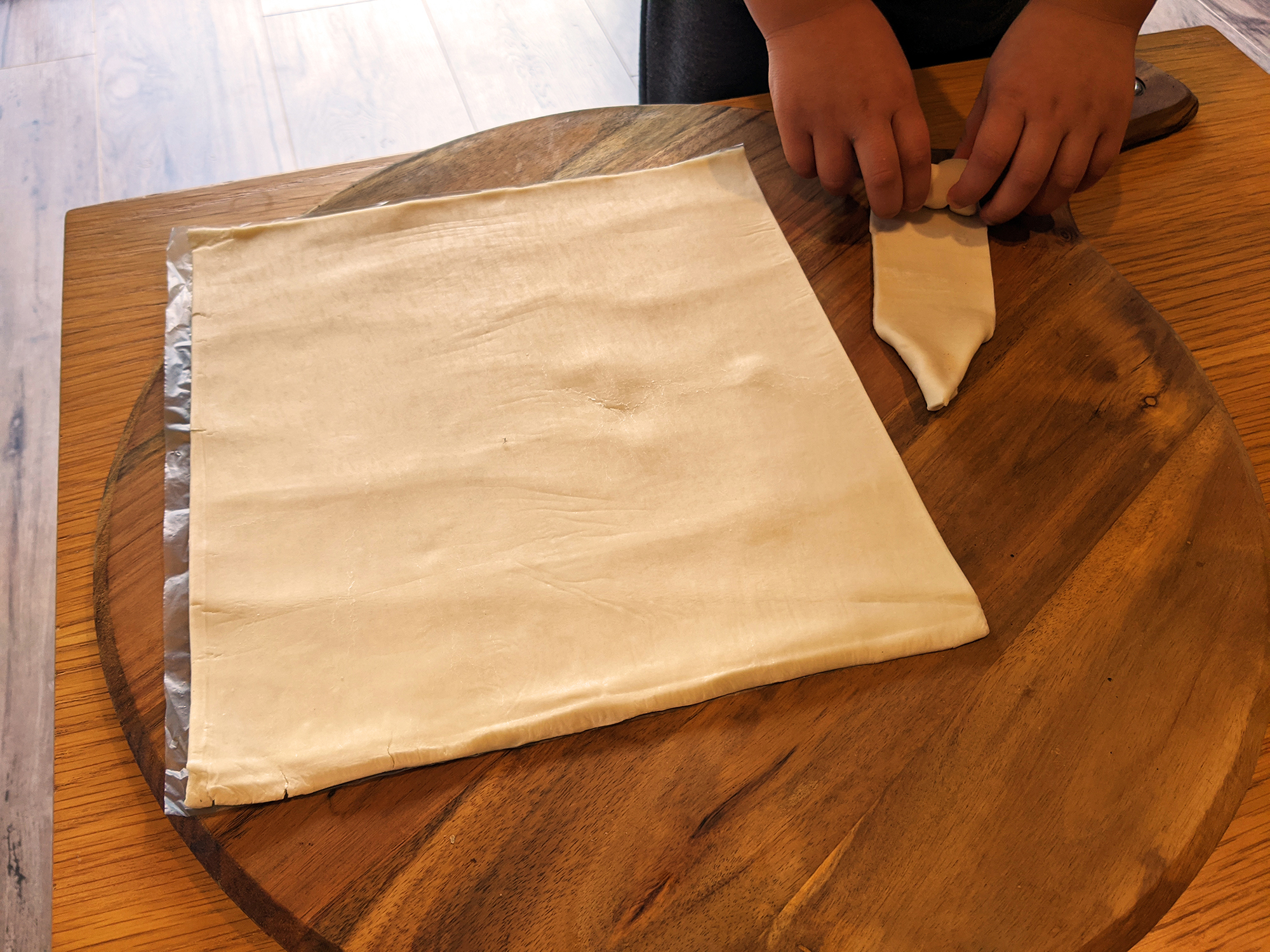 Step 4: To make the body, cut the remaining sheet of puff pastry into five even strips. For each strip, roll a small amount from one edge and squish the sides together to make a head. Leave a gap of about 5 cm in the centre (this is where the scroll will go later!) then tuck the two corners at the other end to make the pointed tail.
