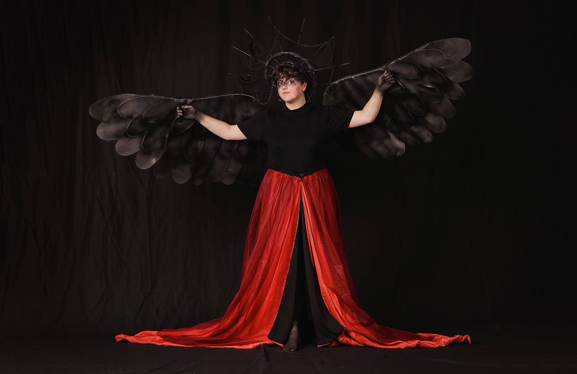 Costume and makeup design: EVA foam, plastidip, PVC piping, PVC elbow, hat base, polystyrene balls, plastic doll eyes, gaffer tape, spray paint, headband, chain, foam, wooden dowel, wooden pegs, papier mâché, polyester, satin, jersey, soft tulle, press studs, cotton, harness straps, foil, masking tape, bolts, nuts, washer water-activated body paint, eyeshadow, charcoal powder, pencil eyeliner